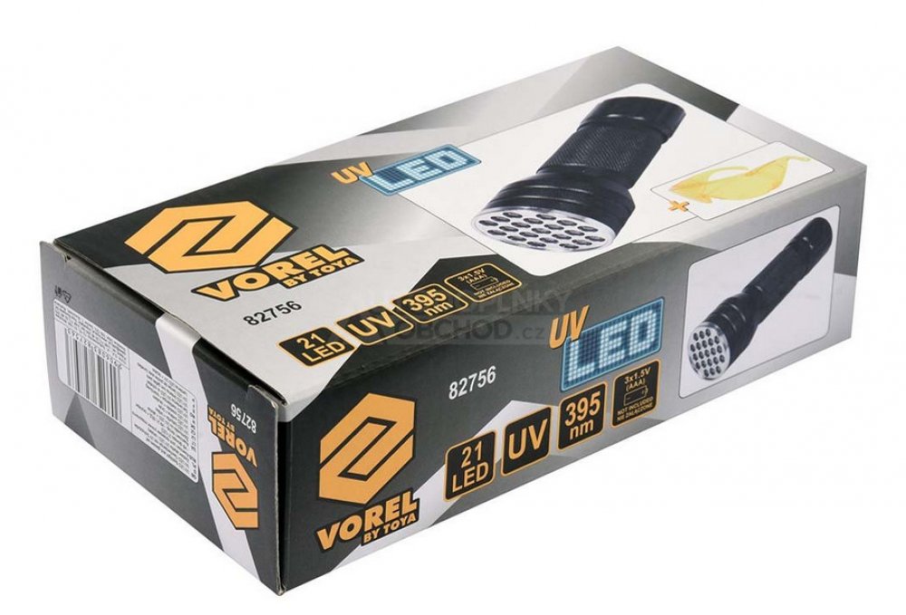 odolné hliníkové tělo, 21 led diod, vlnová délka 395 nm, ochranné brýle proti uv záření, vhodné pro detekci úniků a ověřování pravosti, napájení 3× aaa baterie (nejsou součástí)