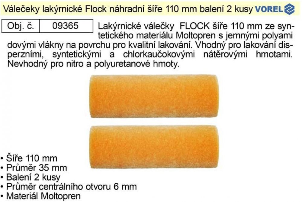 Lakýrnické válečeky FLOCK šíře 110 mm ze syntetického materiálu Moltopren s jemnými polyamidovými vlákny na povrchu pro kvalitní lakování. Velmi vhodný pro lakování disperzními, syntetickými a chlorkaučokovými nátěrovými hmotami. Není vhodný pro nitro a polyuretanové hmoty.