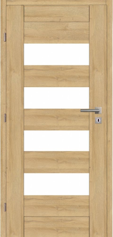 Rámové falcové interiérové dveře Voster MURANO 10 - Pevná, robustní, rámová konstrukce bez voštiny - Rám z MDF desky, šířka vodorovných částí rámů 14 cm - Falc v soft technologii - inovativní způsob polepení rámu, bez hran - Vysoká odolnost proti mechanickému nárazu - Dřevěné kolíky a stabilizační pero - 3 šroubované čepové panty - Dozický zadlabací zámek s obyčejným klíčem - Tvrzené sklo 4 mm - z jedné strany hladké, z druhé strany matné Povrchová úprava fólie Platinum, dub bavorský Rámové falcové interiérové dveře Voster MURANO 10 mají povrchovou úpravu s fólií Platinum. Fólie Platinum je fólie s polypropylenovou povrchovou úpravou, která odolává skvrnám, poškrábání a otěrům. Snadno se čistí, je odolná vůči působení chemických látek a pružná. Jedinečná kombinace reliéfu a tisku napodobuje strukturu přírodního dřeva. Skládá se z 4 vrstev - podkladu, lisované polypropylenové vrstvy, potisku a laku. Vzhledem k tomu, že dekorační folie, kterou jsou potaženy dveře Voster imituje strukturu dřeva, není barevné provedení a textura zaručena po celé délce a šířce stejná. Upozorňujeme, že zárubeň a dveřní kování není součástí dodávky a je nutno je zakoupit zvlášť. Dveře jsou vhodné pro rozetové kování nebo kování s rozteční 72 mm. Dodatečné úpravy Rámové falcové interiérové dveře Voster MURANO 10 je možno dodatečně upravit dle vašeho přání. Veškeré dodatečné úpravy jsou na objednávku a je nutné je konzultovat s našimi odborníky na prodejnách OBI. Za příplatek - Šířka dveří 100 - Dvoukřídlé dveře - cena křídla x2 + příplatek - Lepené bezpečnostní sklo VSG oboustranně hladké 4 mm - Ventilační podříznutí - Ventilační otvory mřížkované PVC pr. 47 mm nebo mosazné pr. 40 mm (šířka křídla 60/70 - 4 ks, šířka křídla 80/90 - 5 ks), mimo kolekci COOLORS - Padající práh - Bezpečnostní cylindrická vložka nebo WC zámek