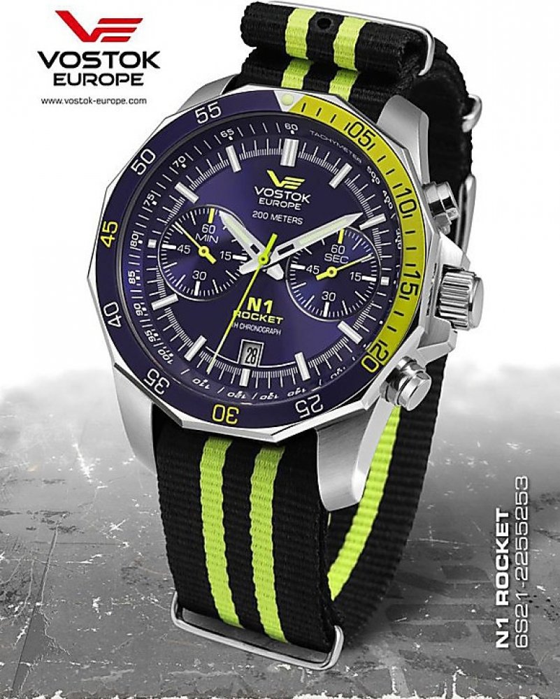 Vostok Europe analogové kůže sportovní pánské bateriové - quartz pro potápění (100+ m) 46 mm ocel 200 m bateriové 135 g minerální bez osazení Rocket N1 kulaté černá modrá s luminiscencí trnová spona 2.2 cm na ruku bez číslic stříbrná ocel velké jednosměrně otočná 17 mm 2 17.0 mm s dočasným svícením (luminiscence/LED) s nenáročnou údržbou (quartz)