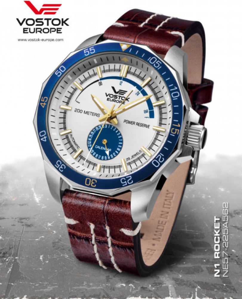 Vostok Europe analogové kůže ocel 200 m automatické minerální sportovní pánské automatické rubíny Rocket N-1 kulaté hnědá vícebarevná na přezku 2.2 cm pro potápění (100+ m) s trvalým svícením (tritium/Super-LumiNova) s občasnou údržbou (automatické) bez chytrých funkcí na ruku bez číslic stříbrná ocel 4.6 cm velké 41 h 17 mm 22.0 mm 17.0 mm 46.0 mm se superluminou