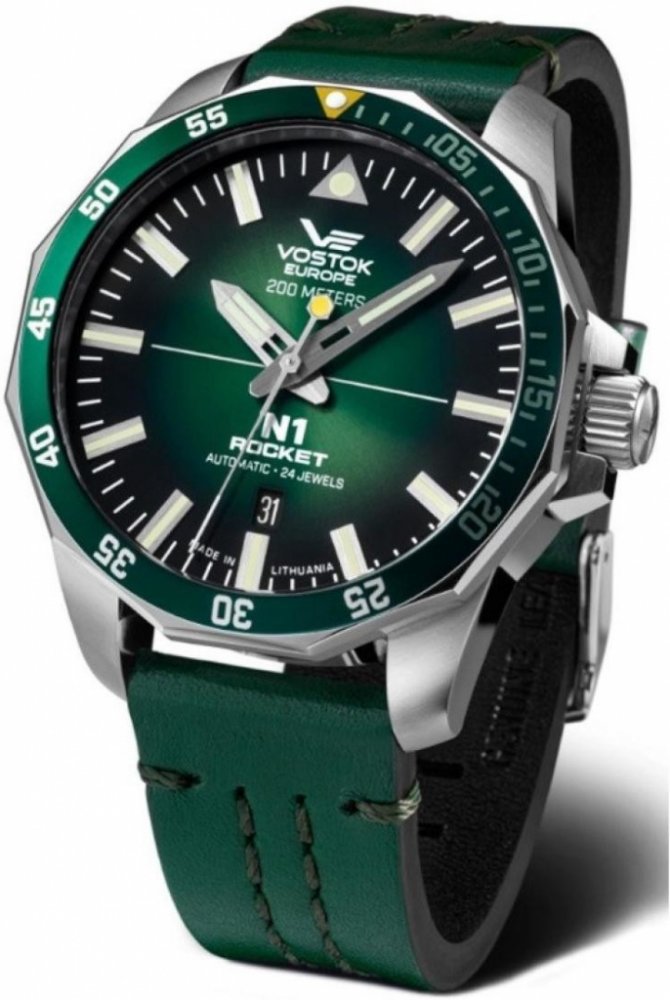 Vostok Europe analogové kůže sportovní pánské automatické pro potápění (100+ m) 46.0 mm ocel 200 m automatické minerální bez osazení N1 Rocket kulaté zelená zelená se superluminou trnová spona 2.2 cm na ruku bez číslic 4.6 cm velké jednosměrně otočná 41 h 17.0 mm 22.0 mm 17.0 mm s trvalým svícením (tritium/Super-LumiNova) s občasnou údržbou (automatické) bez chytrých funkcí