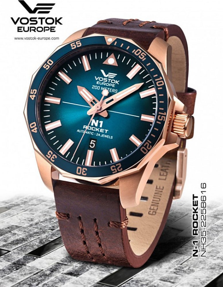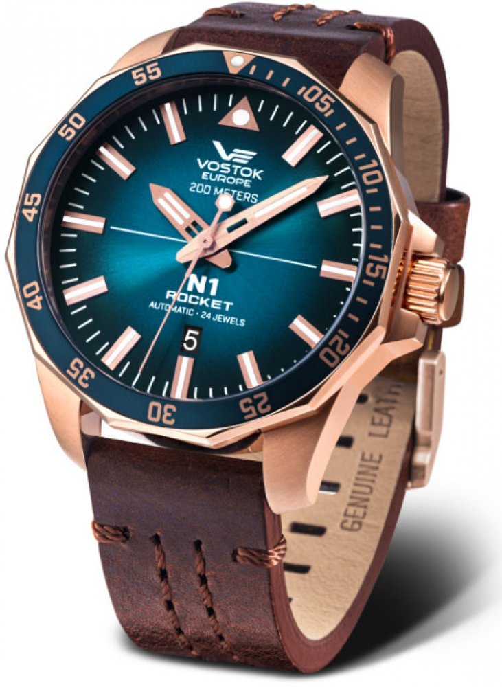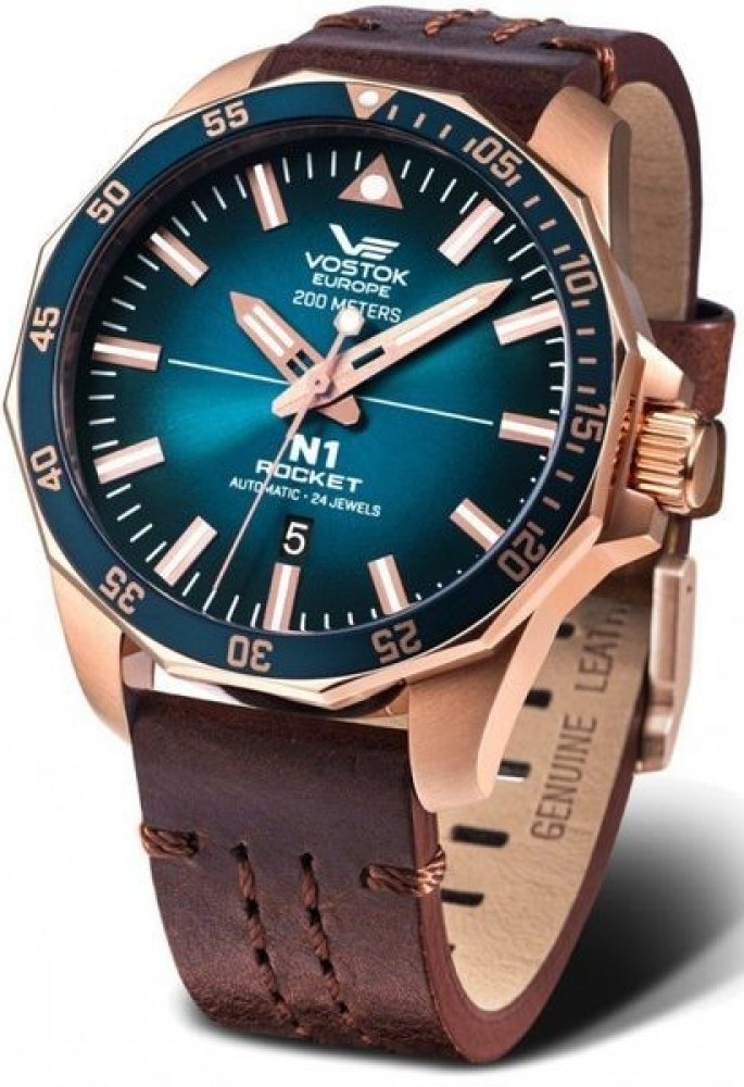 Vostok Europe analogové kůže sportovní pánské automatické pro potápění (100+ m) 46 mm ocel 200 m automatické 131 g minerální 22.5 cm kamínky N1 Rocket kulaté hnědá modrá se superluminou trnová spona 2.2 cm na ruku bez číslic 4.6 cm velké jednosměrně otočná 41 h 17.0 mm 22.0 mm 17.0 mm s trvalým svícením (tritium/Super-LumiNova) s občasnou údržbou (automatické) bez chytrých funkcí