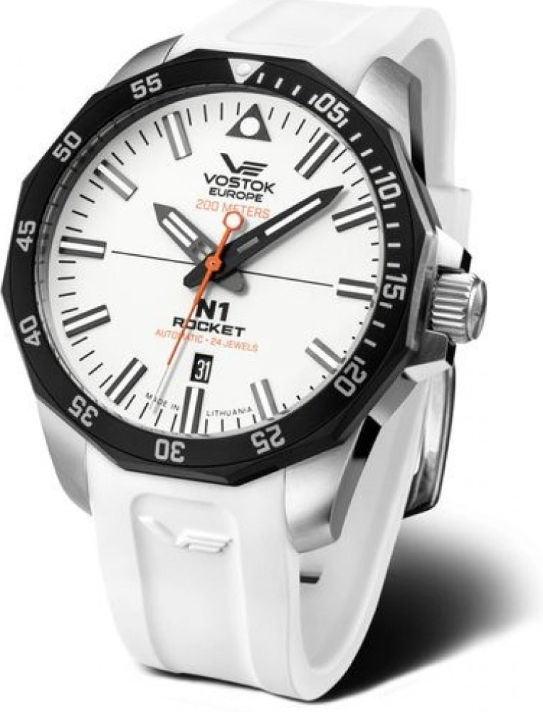 Vostok Europe analogové silikon sportovní pánské automatické pro potápění (100+ m) 46.0 mm ocel 200 m automatické minerální bez osazení N-1 Rocket kulaté bílá bílá se superluminou 2.2 cm na ruku bez číslic 4.6 cm velké ocel 41 h 17.0 mm 22.0 mm s trvalým svícením (tritium/Super-LumiNova) s občasnou údržbou (automatické) bez chytrých funkcí