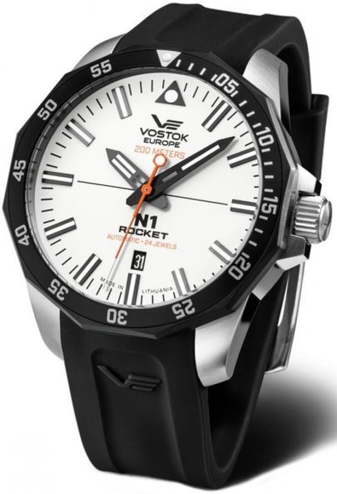 Vostok Europe analogové silikon sportovní pánské automatické pro potápění (100+ m) 46.0 mm ocel 200 m automatické minerální bez osazení N-1 Rocket kulaté černá bílá se superluminou trnová spona 2.2 cm na ruku bez číslic 4.6 cm velké jednosměrně otočná 41 h 17.0 mm 22.0 mm 46.0 mm s trvalým svícením (tritium/Super-LumiNova) s občasnou údržbou (automatické) bez chytrých funkcí