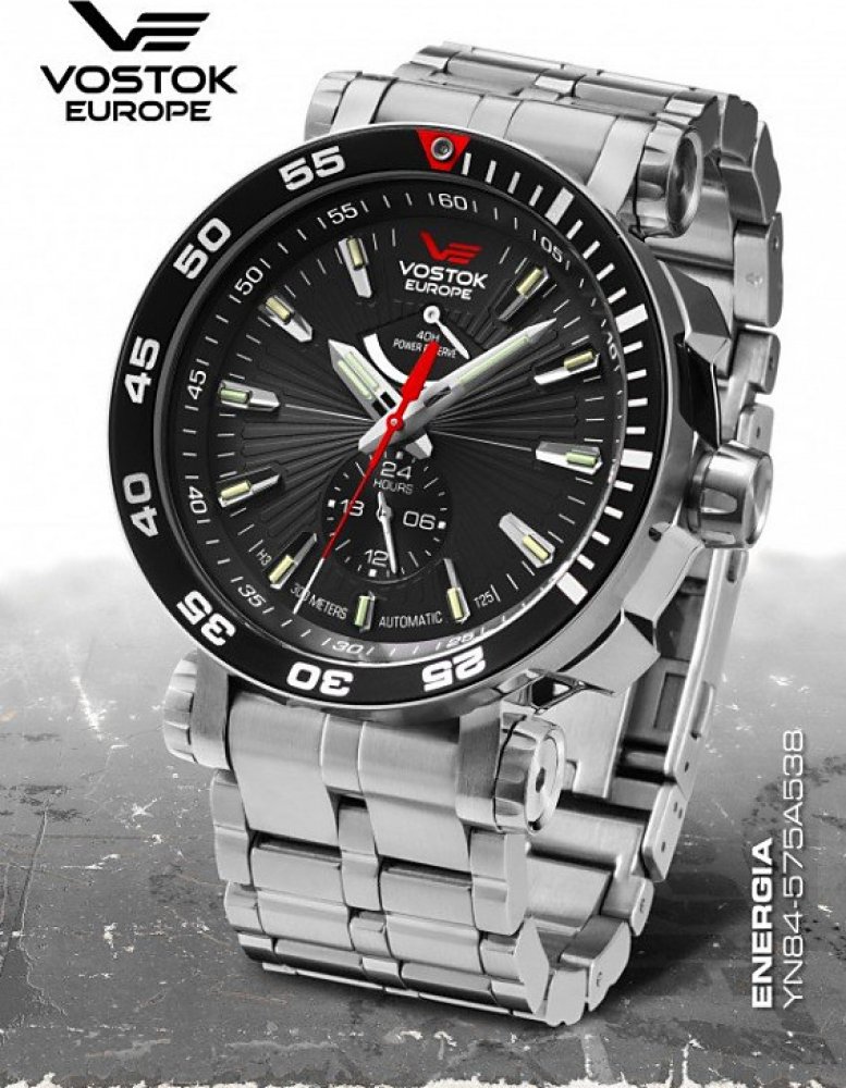 Pánské hodinky Vostok Europe Energia Rocket. Luxusní modely na koženém řemínku nebo kovovém náramku dodávané spolu s náhradním silikonovým řemínkem, šroubovákem ve vodotěsném boxu. Box může sloužit jako úložný prostor pro 4 ks hodinek a náhradní řemínky. Stylový ciferník je osvětlen tríciovými kapslemi na indexech, hodinové, minutové, sekundové ručičce a otočné lunetě. Typ strojku YN84: