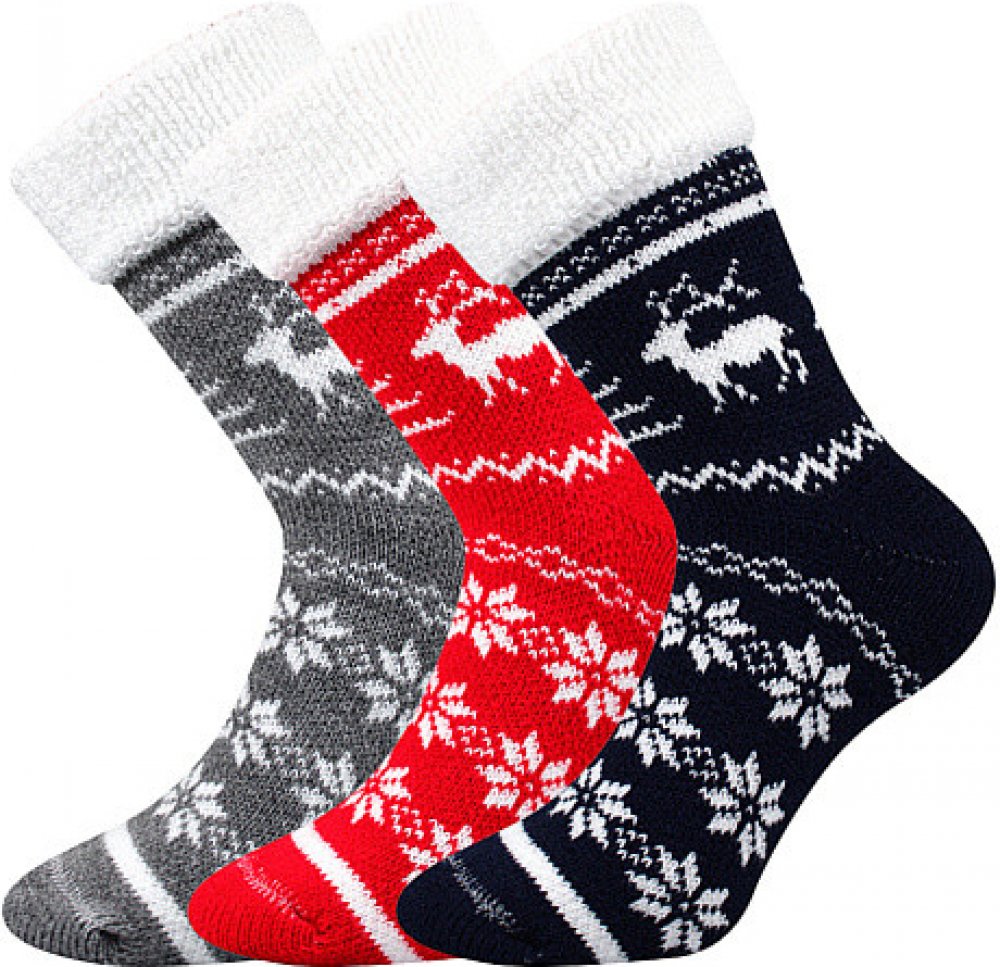 Dámské a pánské ponožky jsou z hřejivého froté úpletu s krásným norským vzorem, v nich zima rozhodně nikomu nebude. Vyšší volný lem je možný přehnout, nosit je můžete jak natažené, tak i hravě ohrnuté. Hřejivé ponožky jsou díky vlně vhodné i na venkovní aktivity do velmi chladného počasí.