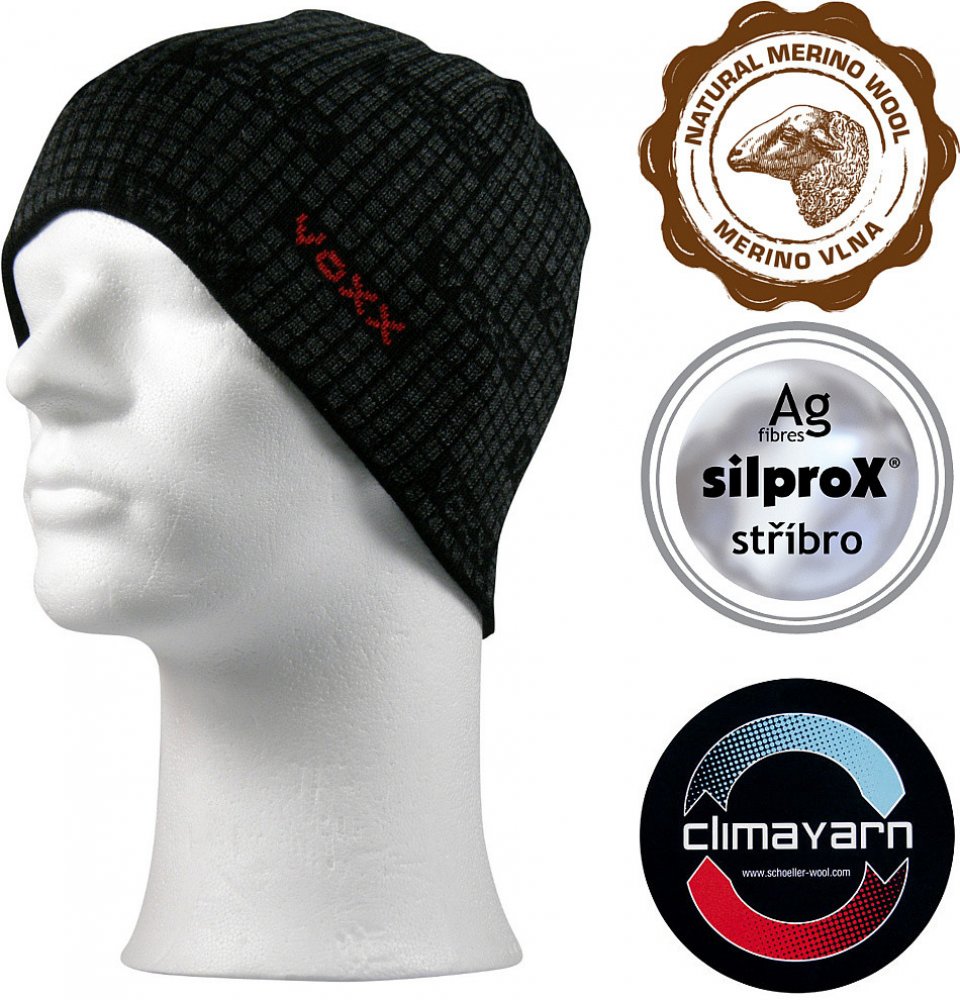 Sportovní oboustraná pletená čepice, materiál CLIMAYARN (merino vlna + polypropylen s ionty stříbra silproX), antibakteriální ochrana.