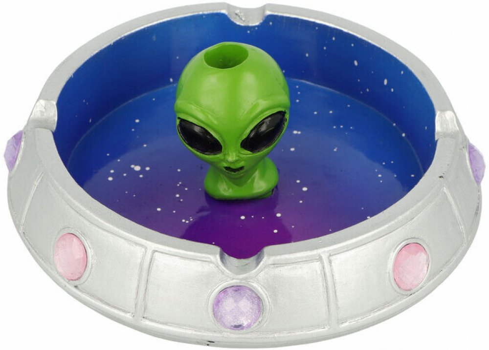 Venkovní cigaretový popelník Alien Meteor. Polyresinový popelník na čtyři cigarety v designu disku s mimozemšťanem je v různobarevném provedení. Po stranách je popelník zdobený barevnými kamínky. Polyresin je druh pryskyřice, která je odolná vůči mechanickému poškození a vlivům počasí. Díky použitému materiálu je popelník vhodný nejen do interiéru, ale také současně pro venkovní použití. Jemná látka na spodní části popelníku zabraňuje poškození povrchu, na kterém popelník leží. Popelník je dodávaný v kartonové krabici.
