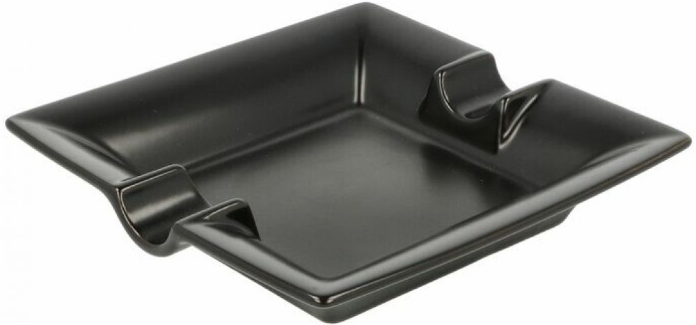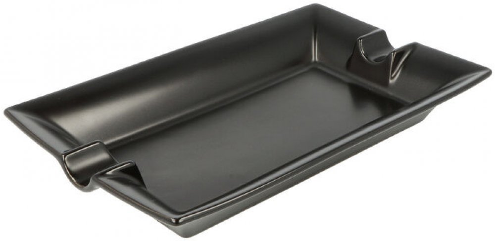 Doutníkový popelník na 2 doutníky. Obdélníkový keramický popelník je v černém matně glazurovaném provedení. Hranatý popelník na doutníky je vybavený dvěma odklady pro doutník. Díky glazuře má popelník hladký povrch, který přispívá ke snadnějšímu čištění. Popelník je dodávaný v kartonové krabici.