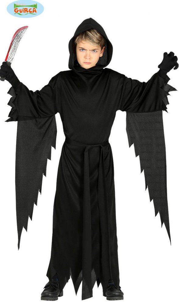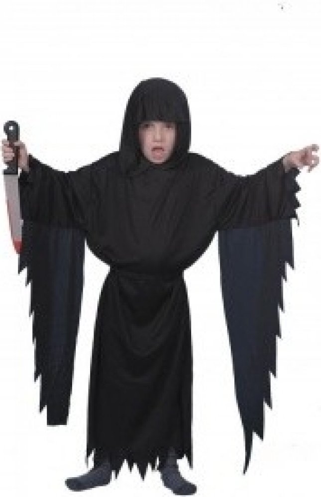 Je ušitý z černého polyesteru a skládá se z dlouhého černého pláště s páskem a s připojenou kapucí.