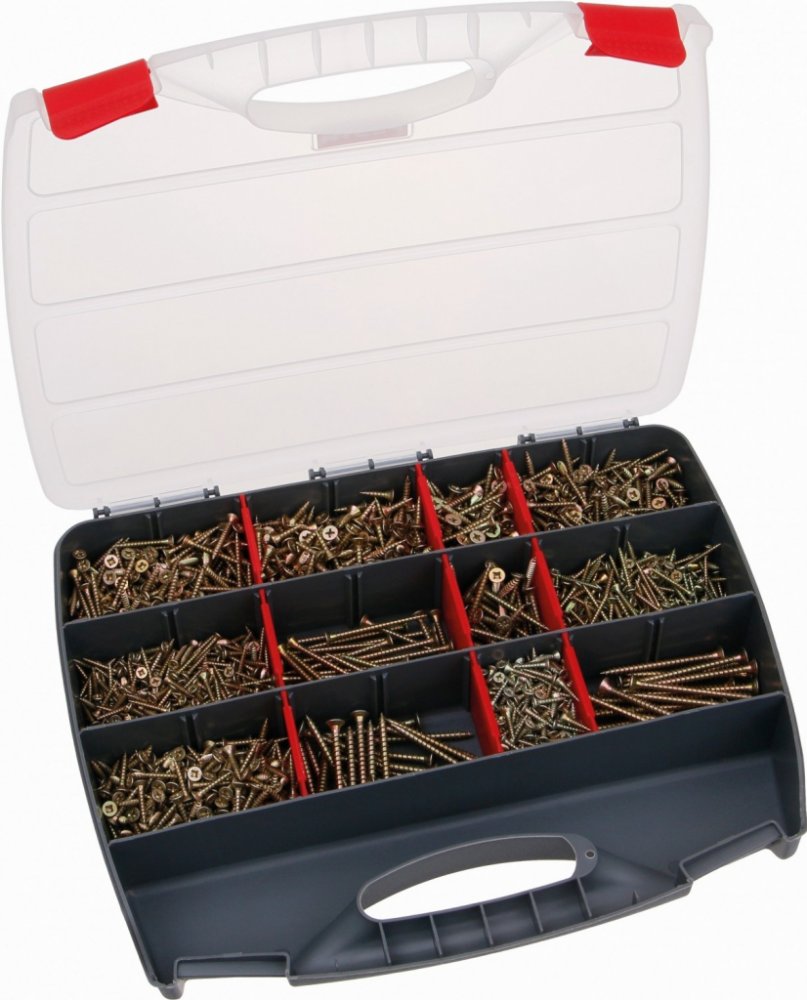 Sada základních druhů vrutů do dřeva v plastovém organizéru. Vhodné pro každou domácí dílnu. Sada obsahuje 12 druhů vrutů celkem 2000 ks. 350 ks - 3,0x16 mm, 280 ks - 3,0x20 mm, 220 ks - 3,0x25 mm, 250 ks - 3,5x20 mm, 240 ks - 3,5x25 mm, 180 ks - 3,5x30 mm, 280 ks - 4,0x16 mm, 80 ks - 4,0x30 mm, 40 ks - 4,0x40 mm, 30 ks - 4,0x50 mm, 25 ks - 5,0x50 mm, 25 ks - 5,0x60 mm. Rozměr organizéru 36 x 26 x 6 cm, hmotnost 2,7 kg.