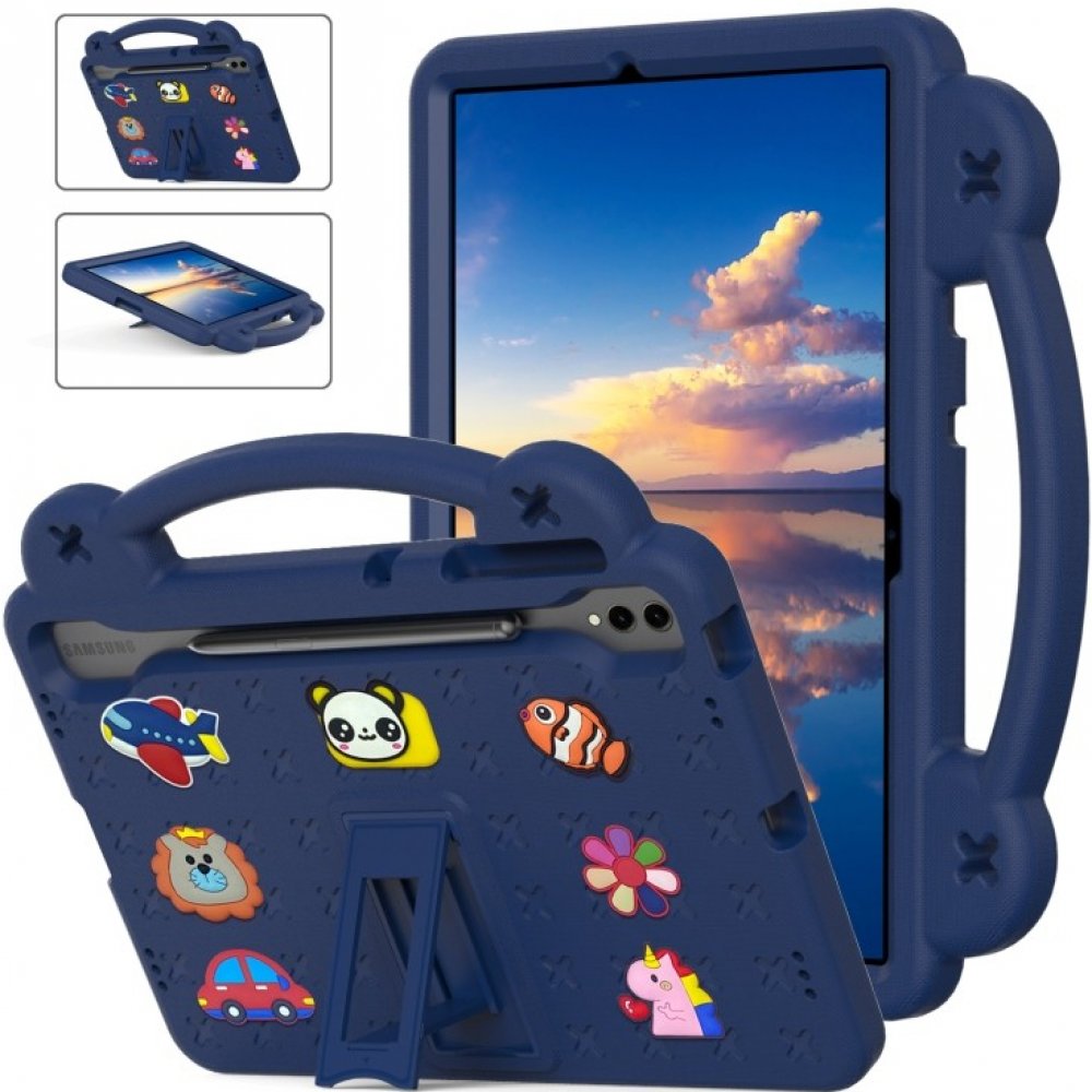 Ochranný obal pro váš Samsung Galaxy Tab S9 FE+ je určen speciálně pro nejmenší. Spolehlivou ochranu při nárazech zaručí použitý vysoce kvalitní materiál EVA. Zvýšené hrany chrání displej a fotoaparát tabletu před rozbitím nebo poškrábáním. Praktické držadlo usnadní dítěti manipulaci s tabletem a vy se nemusíte obávat vyklouznutí. Díky stojanu na zadní straně obalu může dítě sledovat filmy a videa z bezpečné vzdálenosti. Chraňte tablet před poškozením s ochranným obalem navrženým pro děti. určen pro Samsung Galaxy Tab S9 FE+ materiál: EVA přesné výřezy pro konektory a tlačítka zvýšené hrany kolem displeje a fotoaparátu 3D obrázky