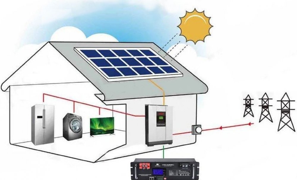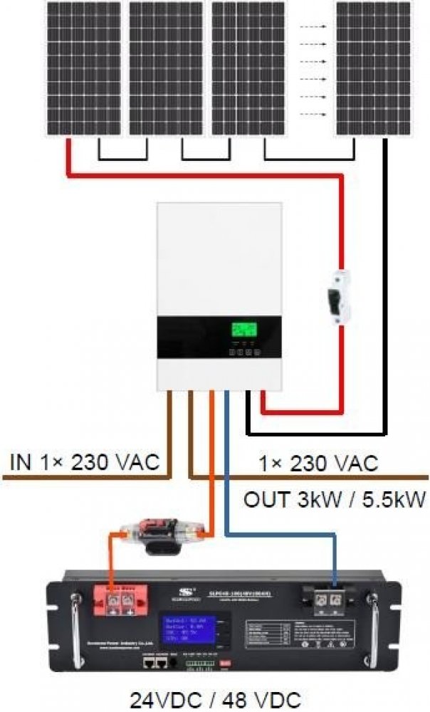 Hybridní systém kombinuje napájení spotřebičů z veřejné sítě a FV panelů. Maximální dodávaný výstupní výkon je 5500W (1×230V). Nepotřebujete žádnou smlouvu s distributorem energie! Měnič přepíná mezi sítí a ostrovním provozem, do veřejné sítě nic nedodáváte - žádné přetoky.