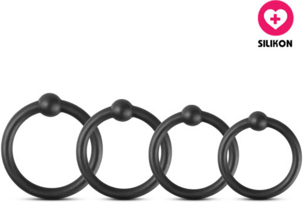 Sada čtyř erekčních kroužků různých velikostí, vyrobených z černého 100% silikonu. Moderní design a různé velikosti pomohou zaškrtit kompletně celý penis. Nejmenší kroužky lze použít jako klasický erekční kroužek k zaškrcení kořene penisu a žaludu. Středním kroužkem je možné zaškrtit varlata případně silnější penisy a největším kroužkem lze zaškrtit penis i varlata zároveň. Jen dokonale spoutaný p...