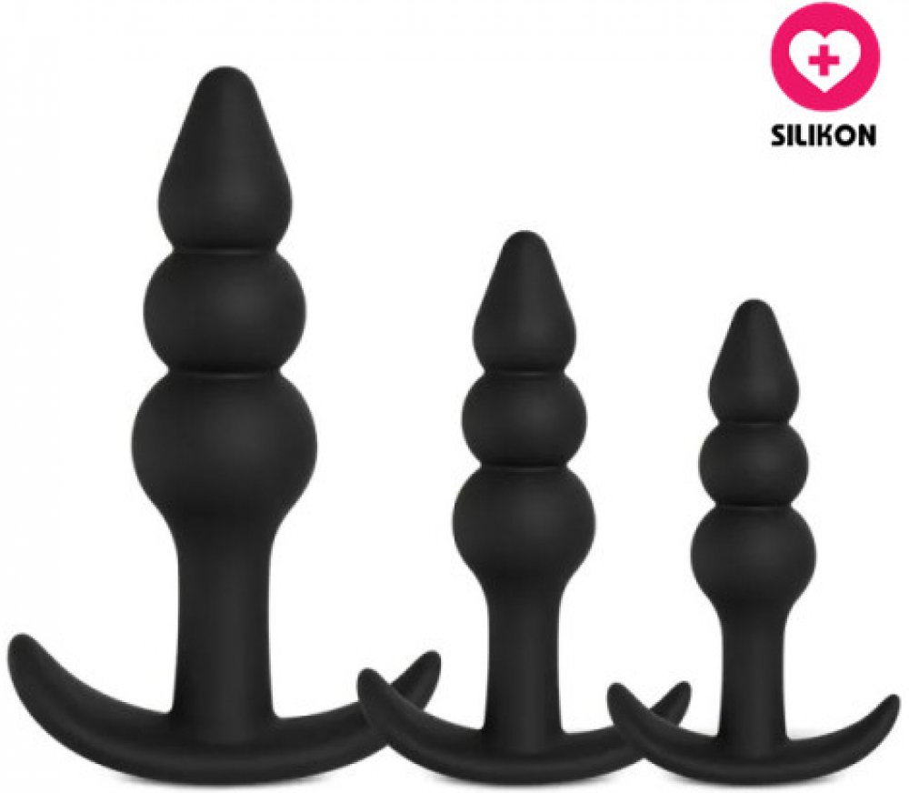 Objevte potěšení s touto sadou tří análních kolíků z kvalitního, 100% černého silikonu, která pomůže roztáhnout a uvolnit před análním sexem, nebo navodí pocitu plnosti v zadečku. Každý kolík je navržen pro postupné rozšiřování a bezpečné použití, s hladkým povrchem a flexibilní texturou. Každý kus má specifický tvar se třemi zaoblenými kuličkami, které poskytují intenzivní stimulaci při zasouvání i vytahování. Oproti klasickým kolíkům má výhodu, že po zasunutí nepřekáží mezi hýžděmi velká kulatá základna, ale kolíky perfektně padnou. Ať již sadu použijete jako tréninkový nástroj k postupnému uvolnění a roztažení análního otvoru před análním sexem, nebo kolíky použijete jako doplněk při souloži pro sebe i Vašeho partnera, zaručeně budete spokojeni.