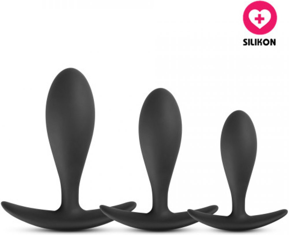Sada tří análních kolíků různých velikostí, vyrobených z černého 100% silikonu, která pomůže roztáhnout a uvolnit před análním sexem, nebo navodí pocitu plnosti v zadečku. Oproti klasickým kolíkům má výhodu, že po zasunutí nepřekáží mezi hýžděmi velká kulatá základna, ale kolíky perfektně padnou. Ať již sadu použijete jako tréninkový nástroj k postupnému uvolnění a roztažení análního otvoru před análním sexem, nebo kolíky použijete jako doplněk při souloži pro sebe i Vašeho partnera, zaručeně budete spokojeni.