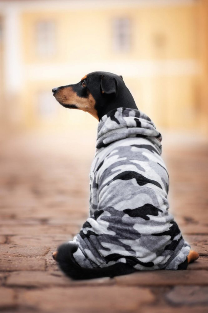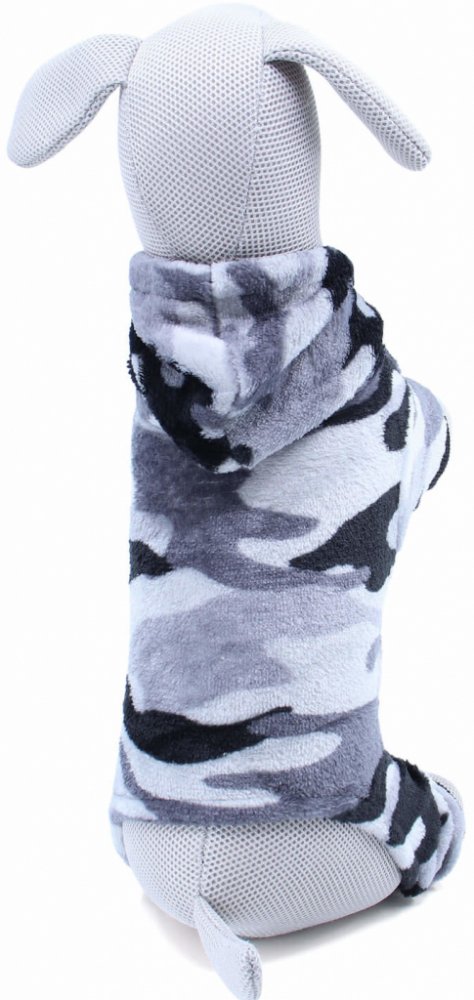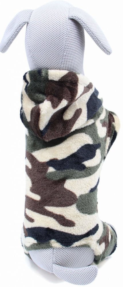 Hřejivá fleecová kombinéza pro psa disponuje snadným zapínáním na patentky na břišní části. Potěší především malá plemena. Velkou výhodou oblečku je to, že zakryje přední i zadní tlapky. Tím, že udržíte psa v teple během chladnějších jarních a podzimních dní, zamezíte jejich prochladnutí. Majitele potěší jednoduchá údržba. V případě ušpinění lze obleček vyprat v pračce. Zajímavé maskáčové provedení. Oblečku dominuje našitá kapuce.