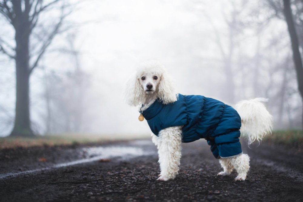 Kombinéza pro psa vyrobena z polyesteru podšitým fleecem.