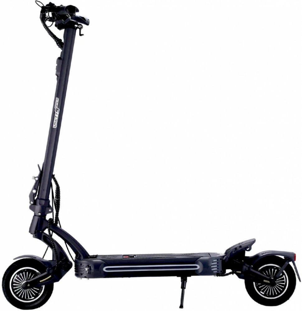 Dvoumotorová elektrická koloběžka s hydraulickými brzdami, silným výkonem a maximální konstrukční rychlostí 50 km/h.
