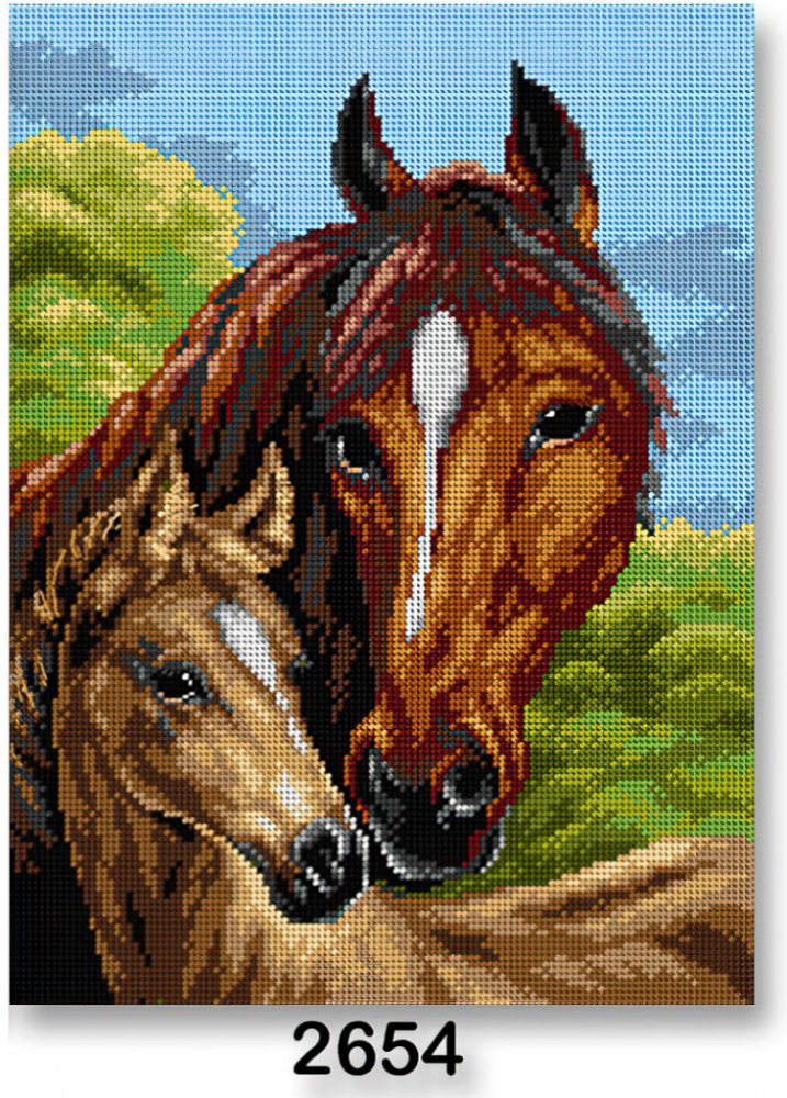 Vyšívací předloha s motivem dvou koní na zeleném podkladu. Předloha na vyšívání ze 100% bavlny je vhodná zejména na křížkový steh, nejlépe při použití přízí mouline (mulinka), které na výšivce nejlépe vyniknou. Obrázek na vyšívání má rozměr 30 x 40 cm.