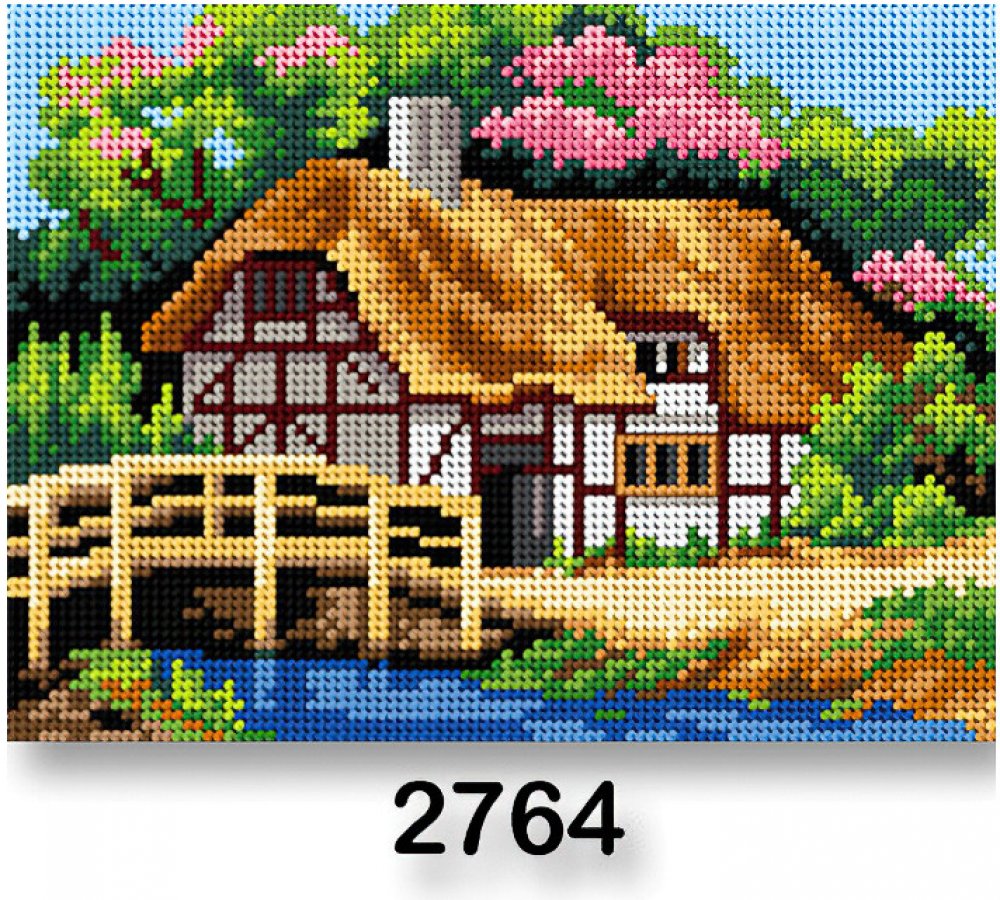 Vyšívací předloha s motivem domku s mostkem se zelenými stromy. Předloha na vyšívání ze 100% bavlny je vhodná zejména na křížkový steh, nejlépe při použití přízí mouline (mulinka), které na výšivce nejlépe vyniknou. Obrázek na vyšívání má rozměr 18 x 24 cm.