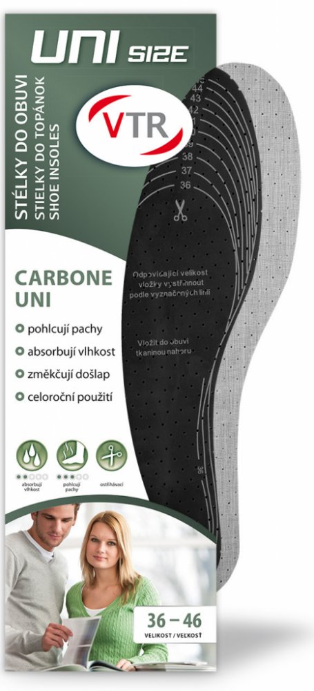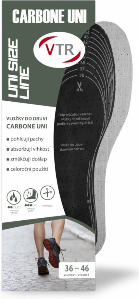 Univerzální stříhací vložky ve velikosti 36-46 jsou vyrobeny z perforovaného šlehaného latexu (latexové pěny) s obsahem aktivního uhlí, který dobře pohlcuje a neutralizuje pachy v obuvi. Povrch tvoří směs bavlny a viskózy. Díky perforaci se lépe provzdušňuje vnitřní část obuvi. Latexová část zároveň změkčuje došlap a tlumí otřesy vznikající při chůzi. Vložky jsou vhodné pro diabetiky a při vyšší potivosti nohou. Požadovanou velikost vystřihnete dle vyznačených linií. Vrstvení vložek vychází z nášlapné vrstvy: bavlna + viskóza, šlehaný latex Délka vložky:36 /46 - 307 mm