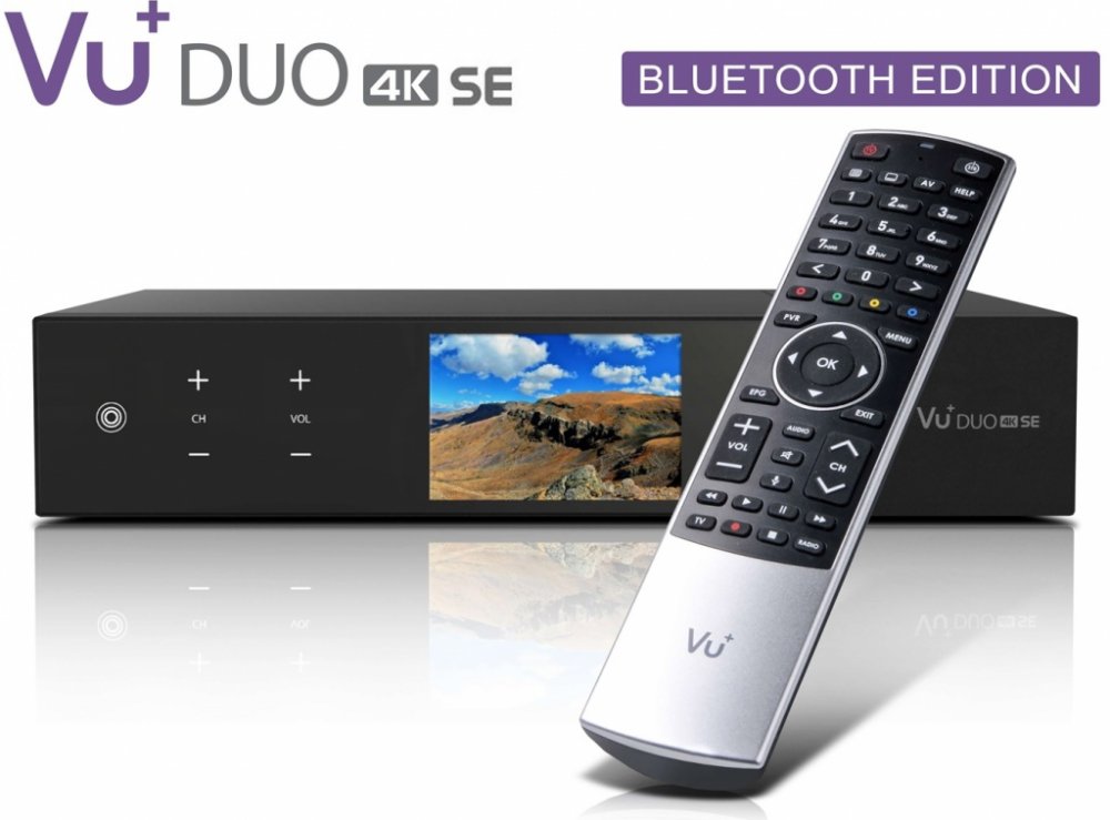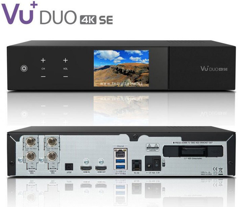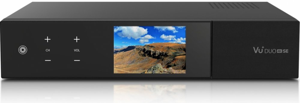 Vu + DUO 4K SE ve verzi s duálním satelitním DVB-S2X tunerem (2x satelitní DVB-S2X + 6x virtuální tuner). Dále obsahuje zabudovanou čtečku karet a dva CI sloty pro vložení přístupového dekódovacího modulu. Přijímač využívá nejvýkonnější čtyřjádrový procesor v modelech Vu + s frekvencí 1,5 GHz doplněný o operační paměť 3GB LPDDR4 a flash paměť 4GB eMMC. Pro nahrávání máte možnost vložení pevného disku 2,5 "s max. kapacitou do 4TB ve vyměnitelných šuplíku, který se nachází na zadní straně přijímače. Možnost osazení až dvou vyměnitelných FBC tunerů (slot A - osazen satelitním FBC tunerem, slot B - volný slot pro další FBC tuner). Pro připojení k internetové síti má přijímač zabudovaný gigabitový ethernet, také je možné jej připojit k internetu pomocí zabudované WiFi. Přijímač disponuje i vestavěným Bluetooth adaptérem, jehož využití je na Bluetooth dálkové ovládání nebo připojení Bluetooth Audio zařízení. Kromě HDMI 2.0 výstupu má přijímač i HDMI IN konektor pro připojení externího zařízení s HDMI připojením (XBOX ONE, PS4, DVD apod.). K připojení USB komponent má Vu + DUO 4K SE zabudované dva vysokorychlostní USB porty 3.0 a jeden 2.0 USB port. Podpora pro obraz v obraze - QUAD PIP.