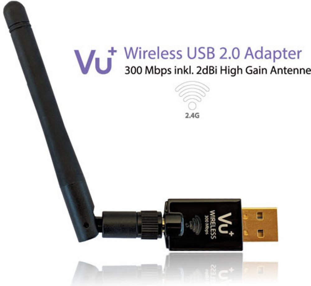 \nUSB WiFi adaptér VU+ 2,4GHz/300Mbps s ANTÉNOU 2dBi\nUSB Wi-Fi adaptér 2,4 GHz se ziskem 2 dBi umožňující připojení do bezdrátové sítě Wi-Fi. Podporuje rychlost bezdrátového přenosu až 300 Mbps. Je u