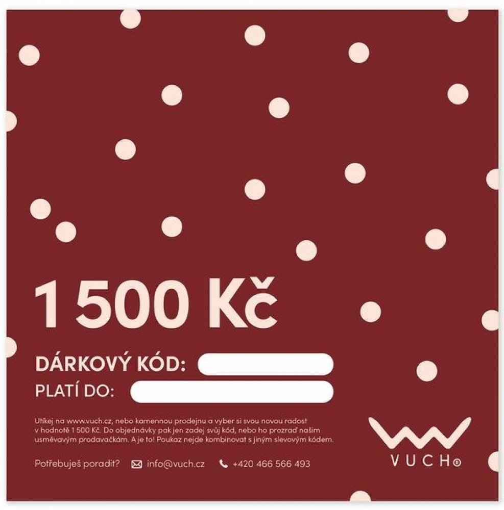 Chceš někomu udělat radost a nevíš, co přesně by si u nás vybral? Dárkový poukaz je ideálním řešením. Tento je nabitý na 1500 Kč. Tak už si jen rozmysli, koho potěšíš novou Vuškou.Vyber si i z našich dalších dárkových poukazů 500 Kč, 1000 Kč, 1500 Kč, 2000 Kč.