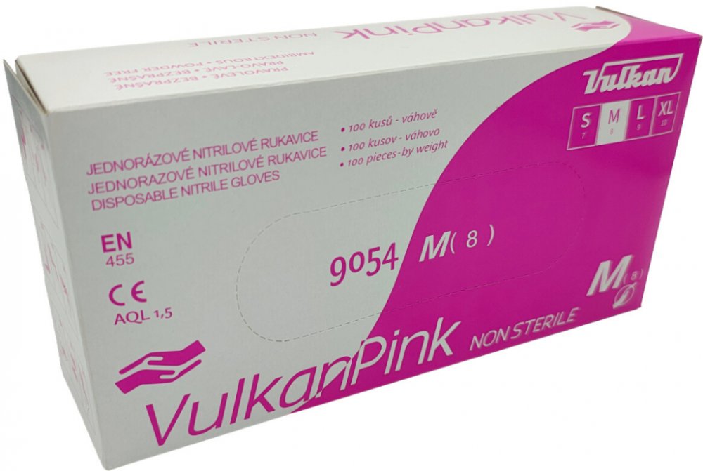 Nitrilové jednorázové ochranné rukavice Vulkan PINK jsou bez pudru, nesterilní. Mají rolovaný okraj, který zachytí možné tekoucí kapky. Rukavice Vulkan PINK sedí na ruce jako druhá kůže. Texturovaný povrch navíc poskytuje vynikající cit doteku a spolehlivý úchop předmětů. Nitrilové rukavice se vyznačují nejlepší mechanickou a chemickou odolností, jsou hypoalergenní (nezpůsobují alergické reakce). Vhodné pro styk s potravinami. AQL 1.5. Délka 24 cm.Velikosti S a M. Barva růžová. Balení 100 kusů. Cena uvedena za balení.Doporučené použitíLékařství, potravinářský průmysl, laboratoř (např. výroba léčiv, příprava léčiv, výzkum), kosmetická a kadeřnická studia, tetovací studia, zdravotní péče apod.Pokyny k použitíNasazují se na suché a čisté ruce. Manžetu umístěte přes oděv, abyste předešli proniknutí kapaliny. Rukavice jsou určeny pouze pro jednorázové použití. Při sundávání rukavic se nedotýkejte jejich vnější strany, přehněte konec manžety a stáhněte je otočením naruby.Pokyny ke skladováníRukavice skladujte v jejich originálním obalu, chráněné před přímým sluncem, v dostatečné vzdálenosti od zdrojů tepla.