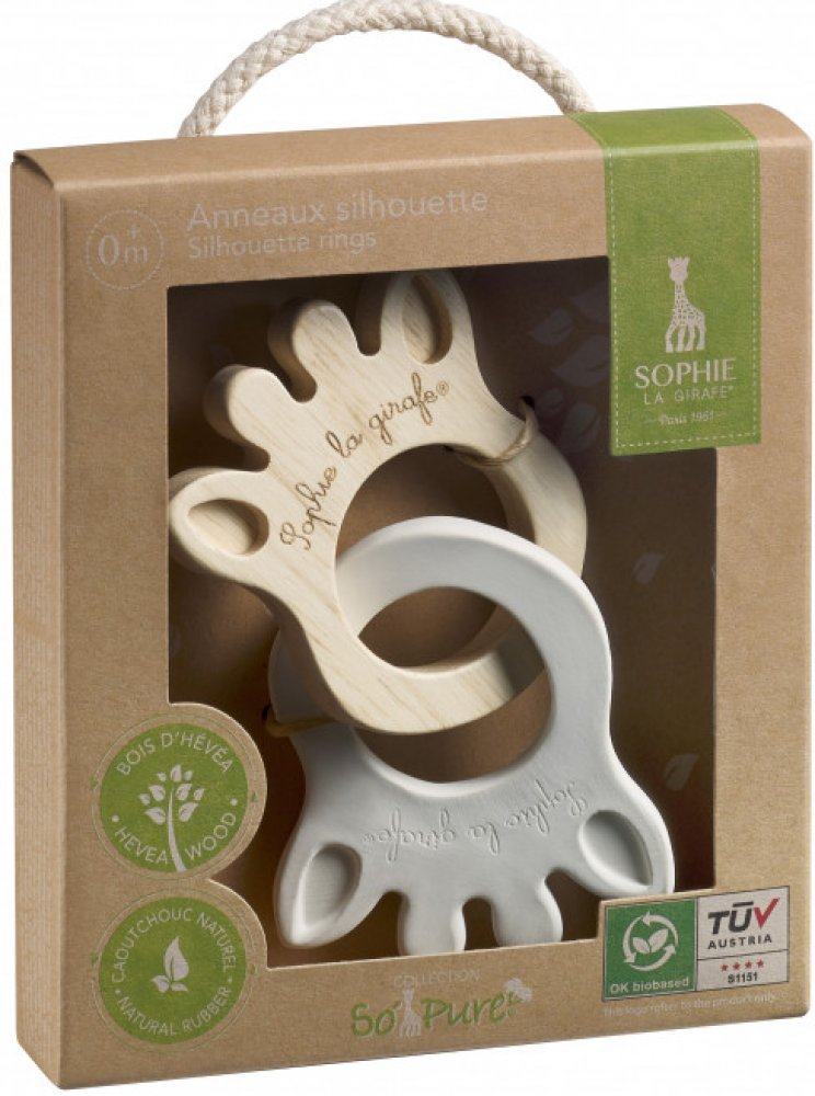 Dva kousací kroužky tvarově zpodobňují siluetu hlavy žirafky Sophie. Jsou přírodní , vyrobené z přírodní gumy a kaučukového dřeva. 2 různé tvrdosti pro lepší masáž bolavých dětských dásní díky rohům a uším jsou různě tvarované a dítě je snadněji může žvýkat Lehké , snadno uchopitelné i malýma dětskýma rukama!