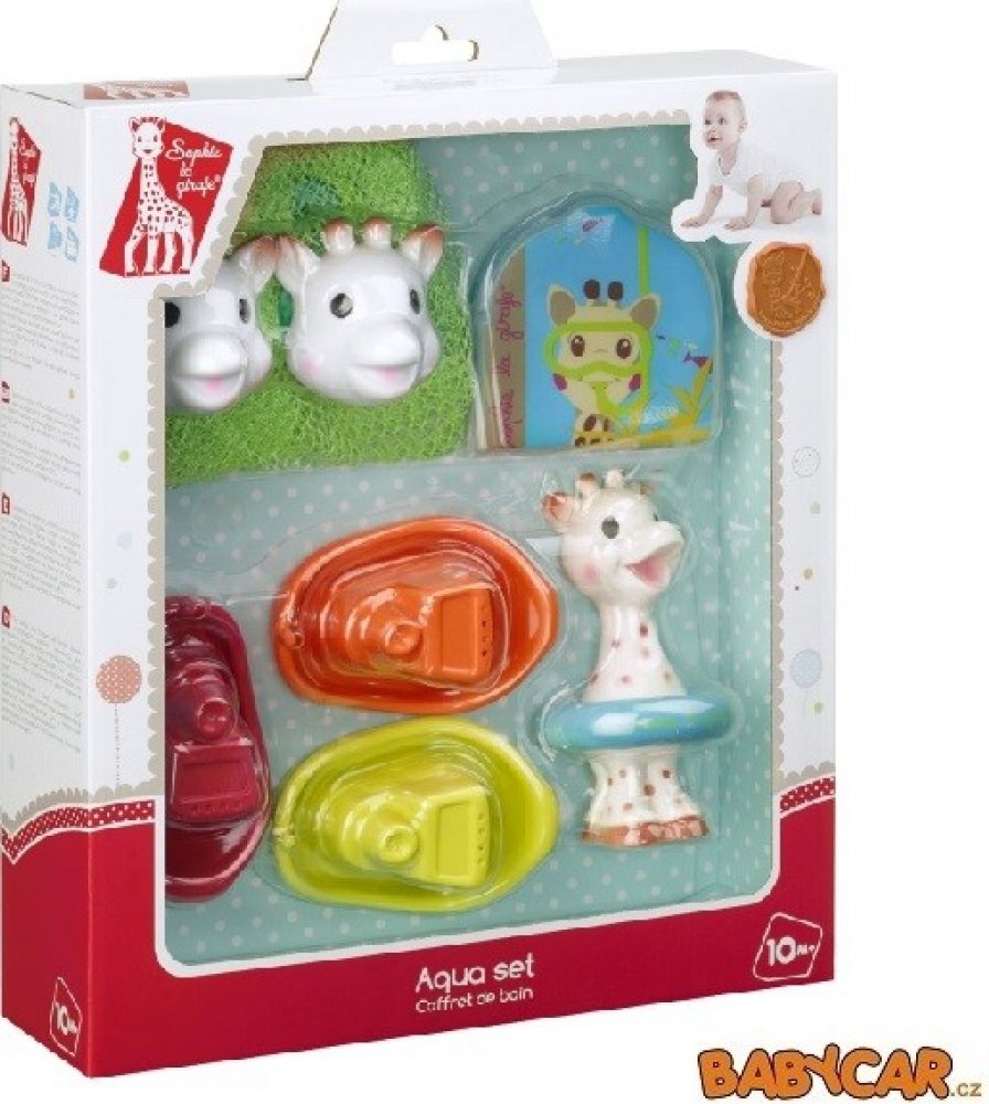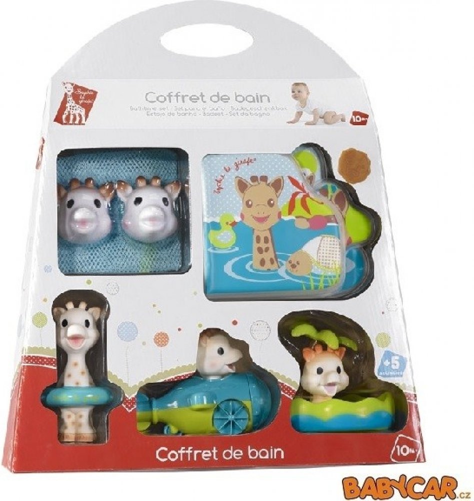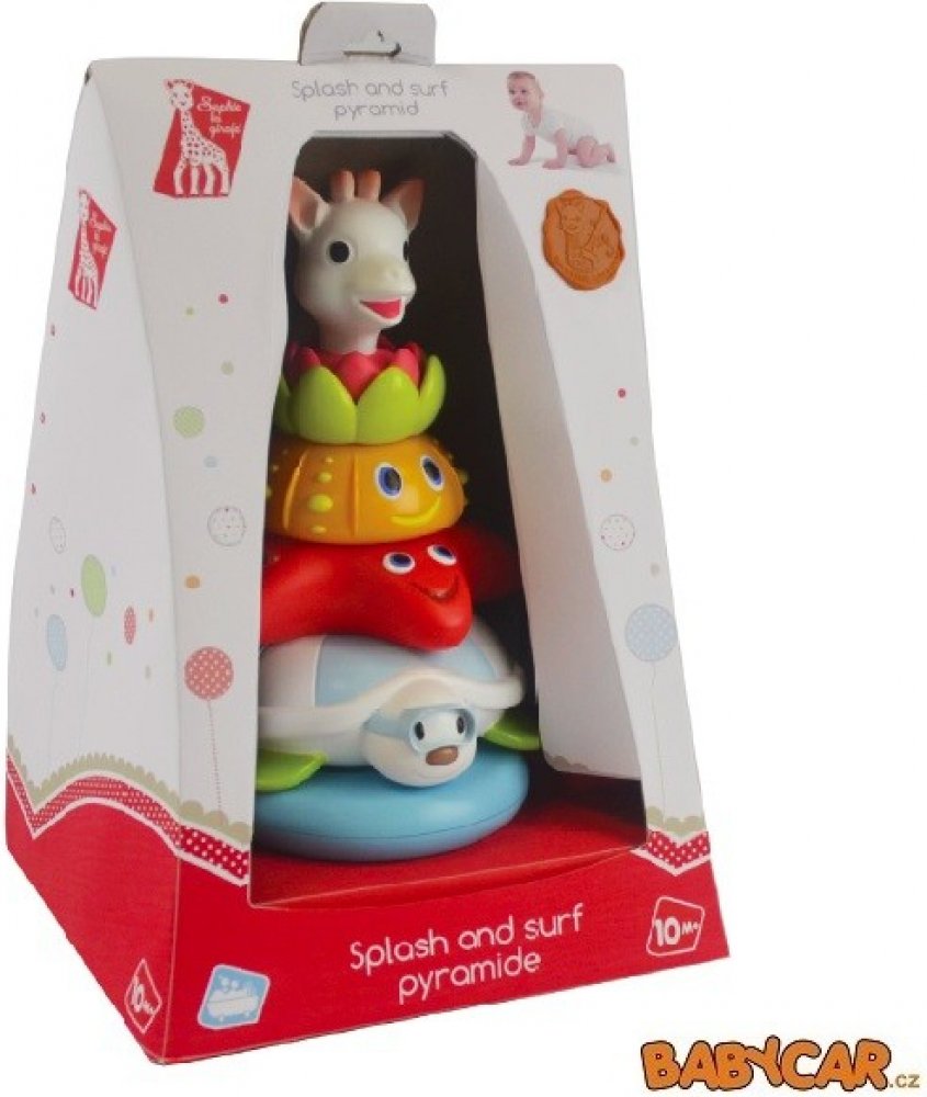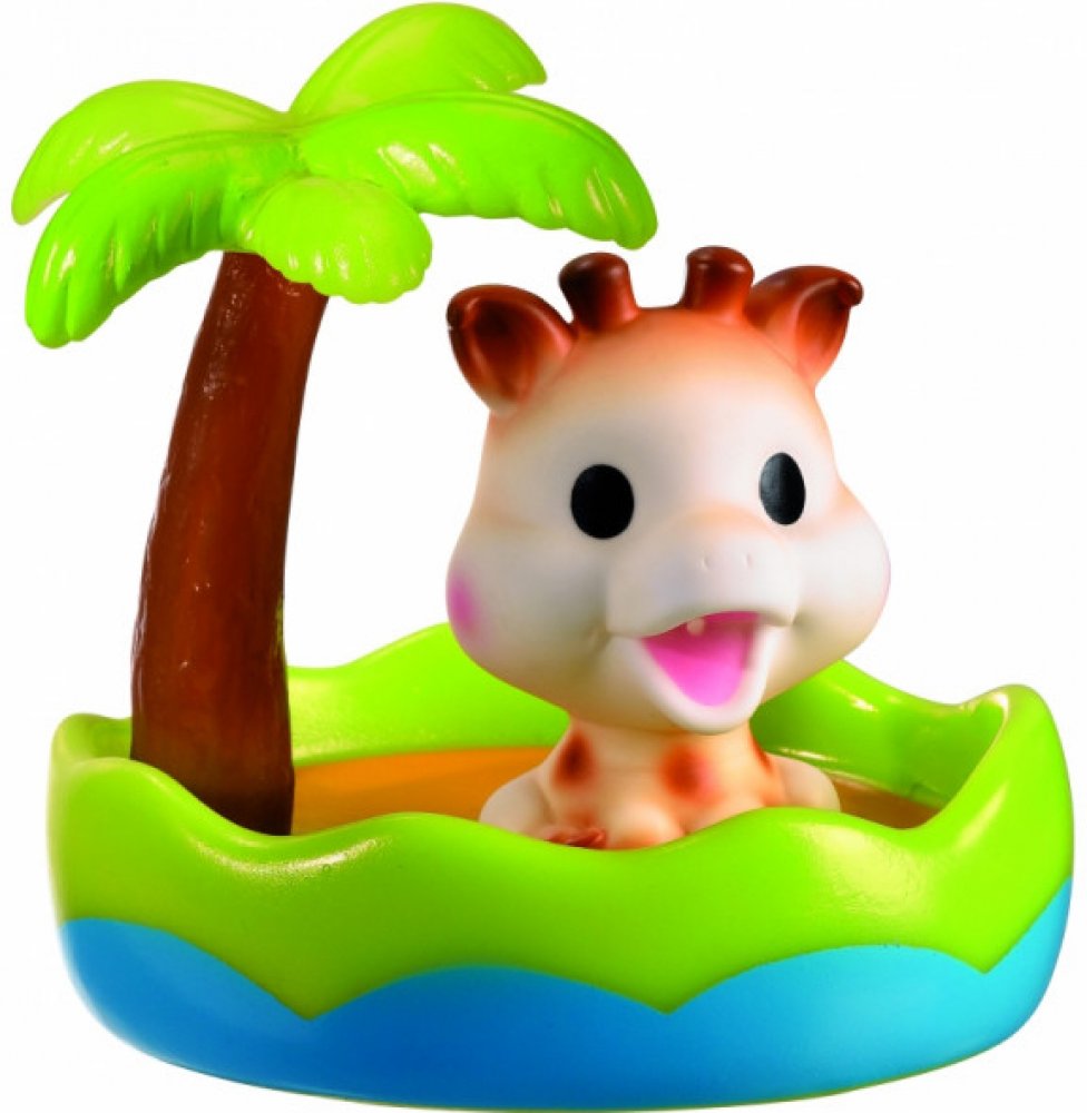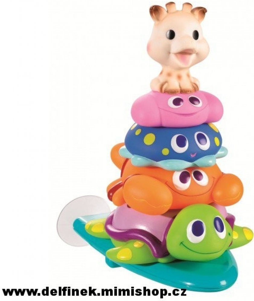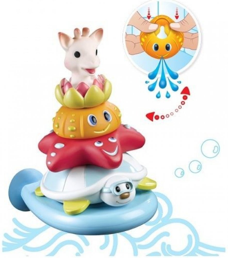 • plovoucí žirafku Sophie, která při stlačení stříká vodu