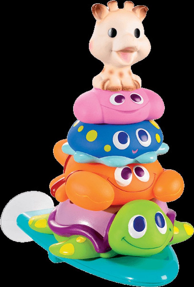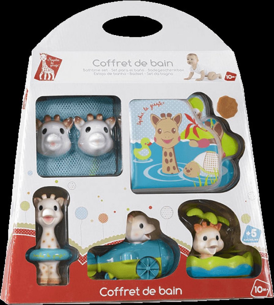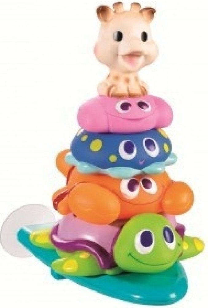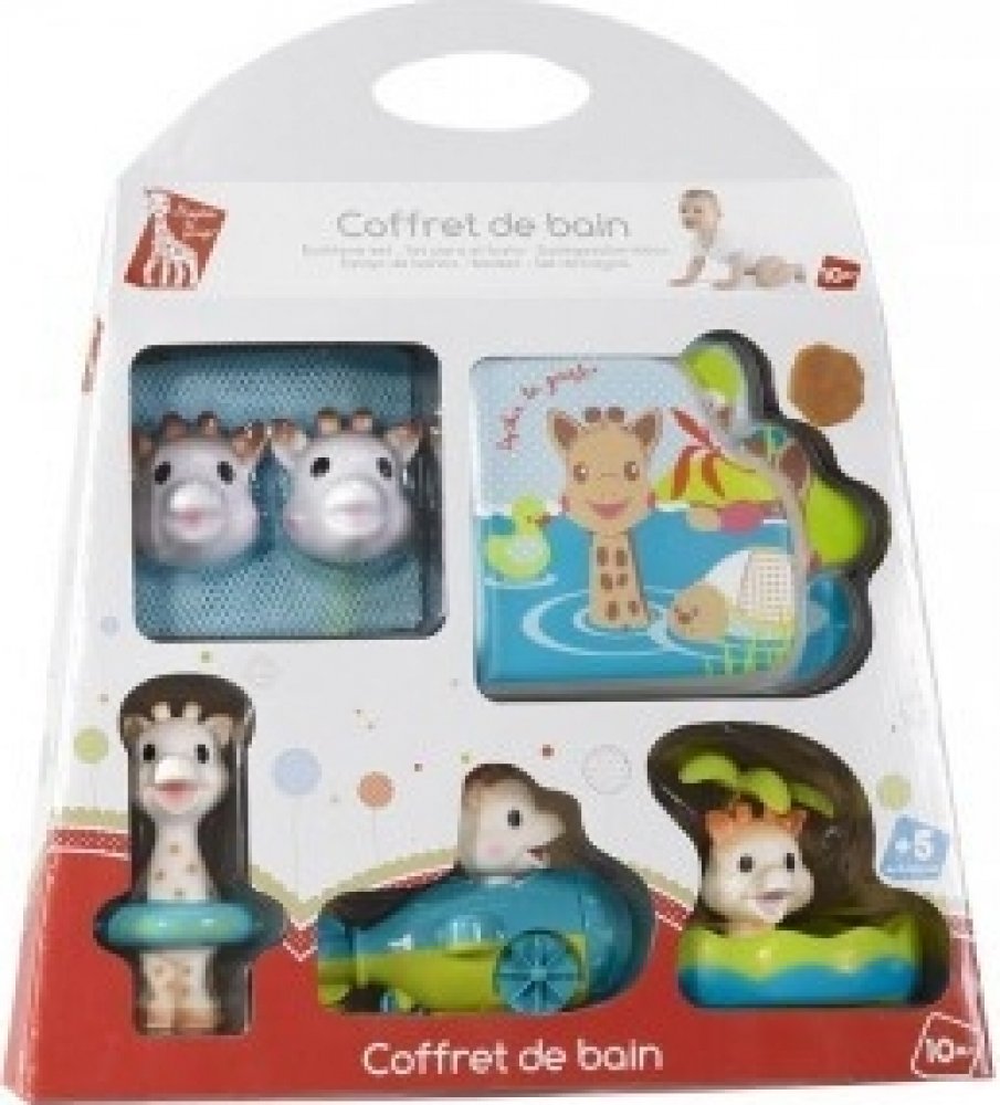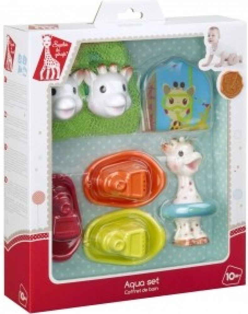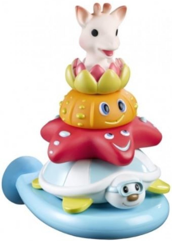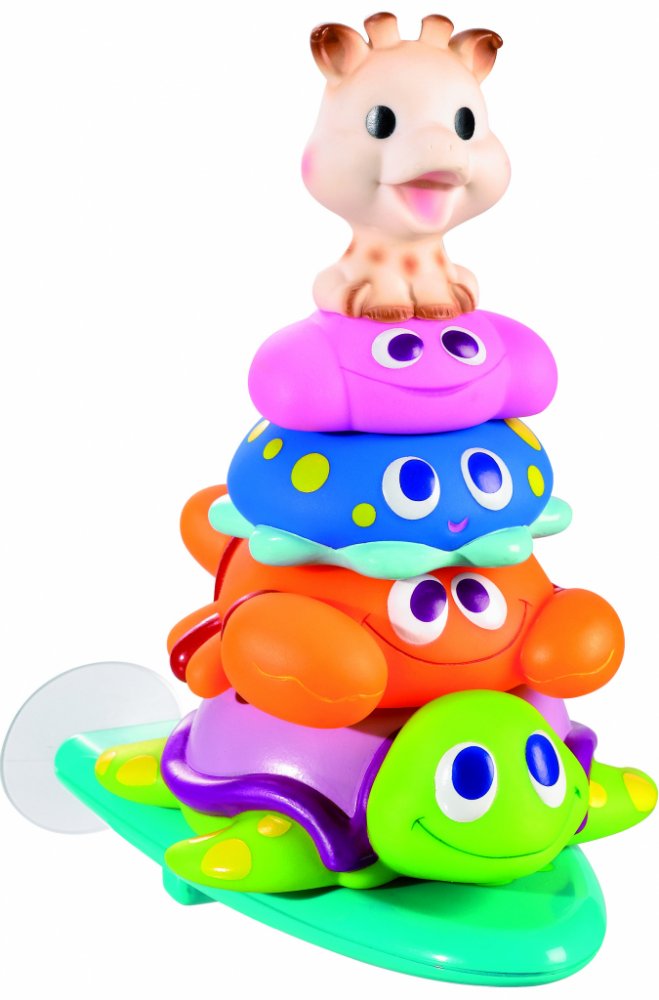 • plovoucí žirafku Sophie, která při stlačení stříká vodu