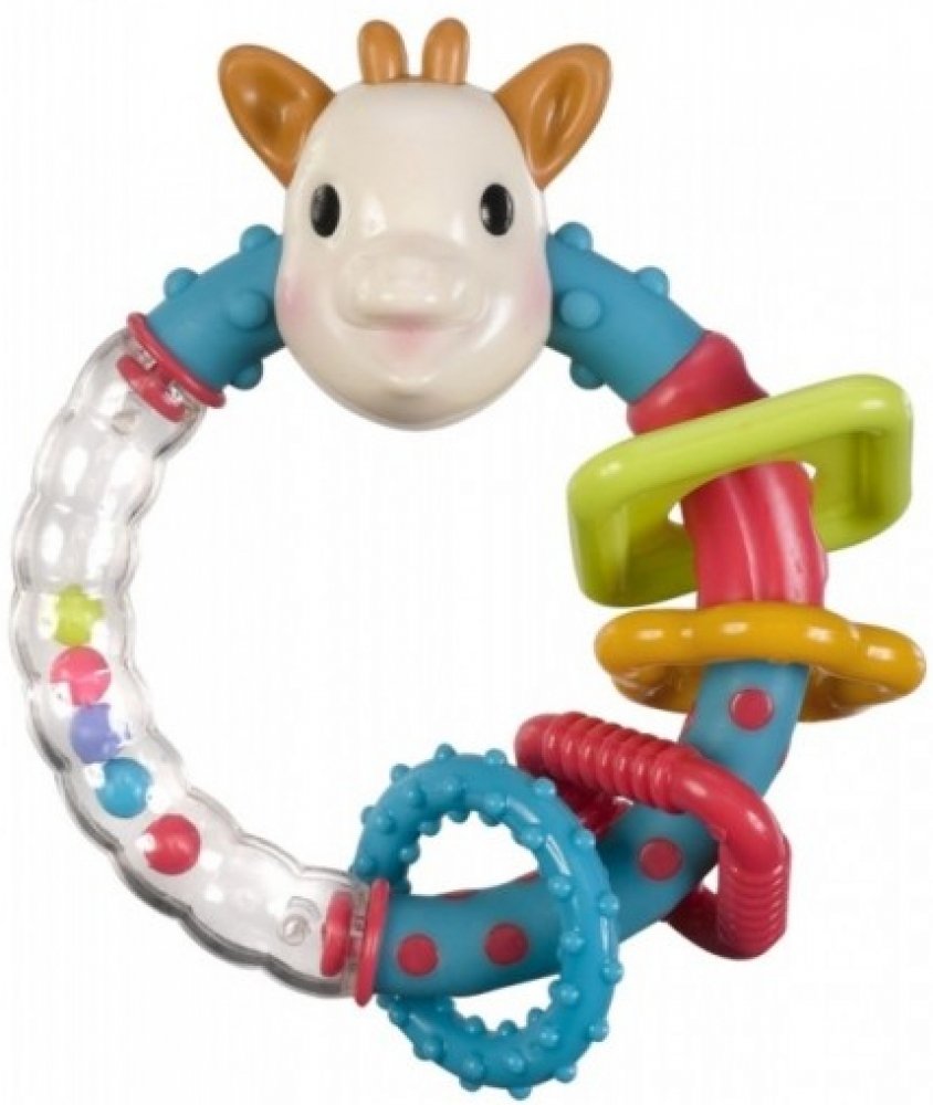Jemné barvy a zaoblené tvary tohoto chrastítka si vaše děťátko přímo zamiluje. Dvě kuličky, které dítě může otáčet, mění barvy a hlava žirafy Sophie se točí kolem dokola. Zatřeste a užívejte si jemné zvuky.