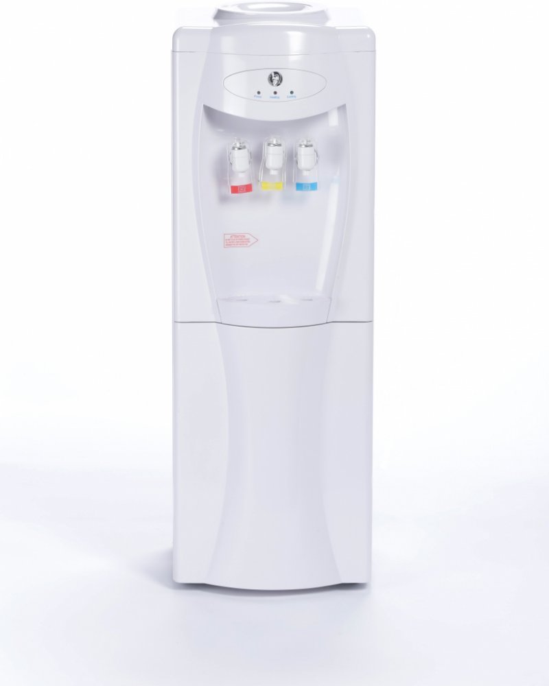 Vysoký výdejník v bílé barvě na studenou a horkou vodu určený k postavení na zem. Výdejník je vybaven elektronickým chlazením, takže jeho chladící výkon je malý. Boky přístroje jsou z bílého plechu a přední část z bílého plastu. Na boční straně výdejníku se samostatně vypíná či zapíná ohřev a chlazení, takže je možnost při vypnutí ohřevu čerpat z červeného kohoutku vodu nechlazenou a používat výdejník k výdeji vody chlazené a nechlazené (pokojová teplota).Svým nízkým chladícím výkonem je tento výdejník vhodný pro užívání malým počtem osob.Výdejník je osazen 3 opěrnými kohoutky s možností 3 pozic čerpání vody.1. pozice: Kelímkem odtlačíme kohoutek od sebe a po dobu odtlačení teče do kelímku voda. Tuto polohu nelze zaaretovat.2. pozice: Páčku kohoutku přitáhneme k sobě a rychle vložíme pod kohoutek kelímek. V této pozici je páčka kohoutku zaaretována a voda teče nepřetržitě do doby, než páčku vrátíme mechanicky do svislé polohy.