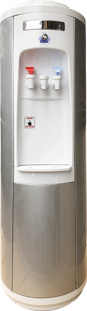 Vysoký podlahový výdejník v bílé barvě na studenou a horkou vodu určený k postavení na zem. Výdejník je kulatý, vyrobený z světle šedě lakovaného plechu. Podstavec, vrchní a střední část jsou z bílého plastu. Na zadní straně výdejníku se samostatně vypíná či zapíná ohřev a chlazení, takže je možnost při vypnutí ohřevu čerpat z červeného kohoutku vodu nechlazenou a používat výdejník k výdeji vody chlazené a nechlazené (pokojová teplota).Výdejník je osazen 2 kohoutky, kdy kohoutek na horkou vodu je opatřen dětskou pojistkou.
