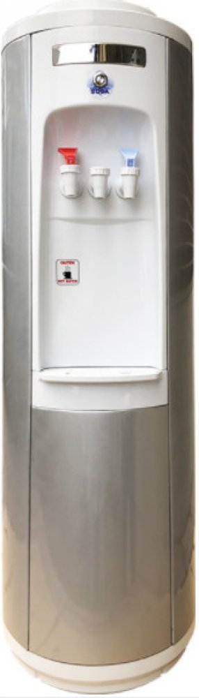 Vysoký podlahový výdejník na barely na studenou, teplou a perlivou vodou, který slouží k postavení na zem. Výdejník je kulatý, vyrobený ze světle šedého lakovaného plechu. Podstavec, vrchní a střední část jsou z bílého plastu. Na zadní straně výdejníku se samostatně vypíná či zapíná ohřev a chlazení, takže je možnost při vypnutí ohřevu čerpat z červeného kohoutku vodu nechlazenou a používat výdejn...