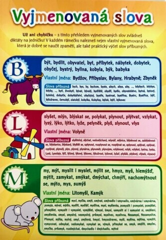 Vyjmenovaná slova - Pomůcka pro školáky S tímto přehledem vyjmenovaných slov se naučíš všechna vyjmenovaná slova levou zadní! Příjemný A5, vhodný třeba do sešitu. z kategorie Knihy | Učebnice | Přehledy a výukové pomůcky | Jazykové přehledy | Český jazyk od SUN naleznete ne e-shopu KnihyDobrovsky.cz!