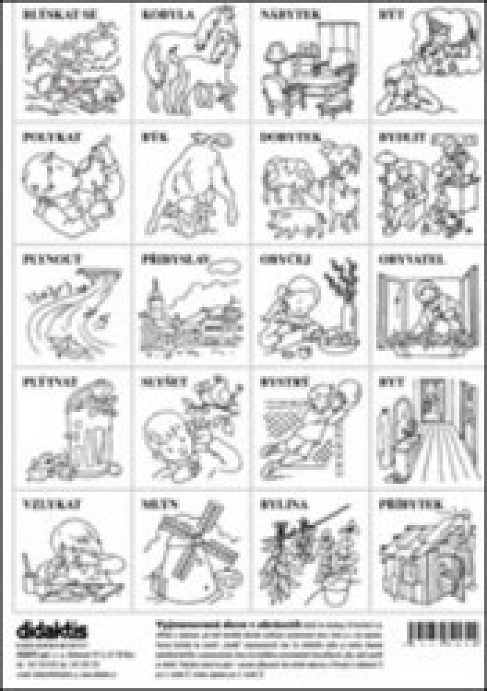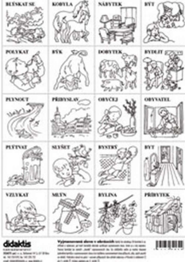 Každý list obsahuje 20 čtverečků – kartiček k vystříhání a vybarvení, které tvoří černobílý obrázek vystihující vyjmenované slovo, které je u něj psacím písmem napsáno. Pomocí kartiček lze vytvořit slovník vyjmenovaných slov, do zvláštního sešitu se budou vlepovat jednotlivé kartičky s vyjmenovanými slovy a ke každému zaznamenávat slova příbuzná, příp. jejich použití ve větách.