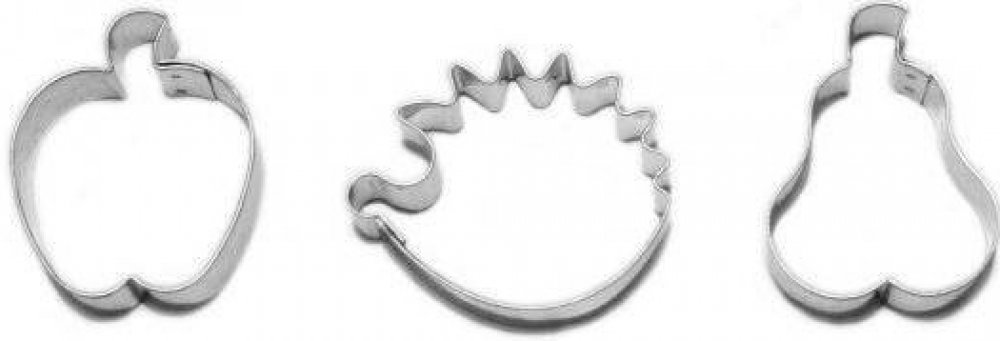 Tři vykrajovátka z kvalitního pocínovaného plechu – ježek, jablko a hruška.