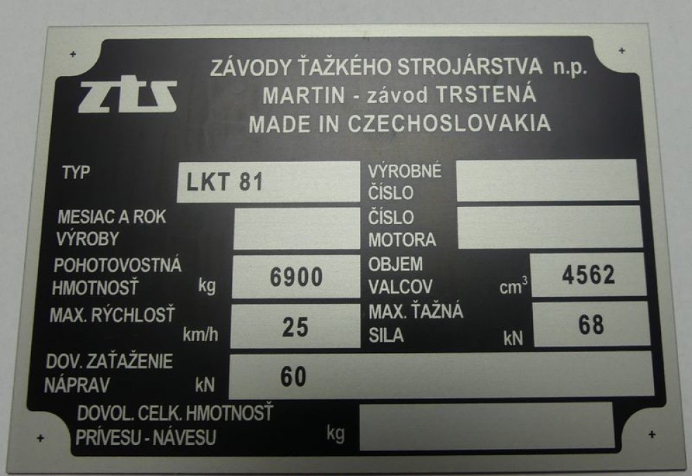 Věrná replika původních štítku.Provedení elox. hliník. Doživotní záruka na černou barvu.Další služba: Na výrobní možný dotisk nebo ražba (raznice 4mm) Vašich údajů. Dotisk nebo ražbu Vašich údajů nutno doobjednat jako "Ražba údajů" nebo "Dotisk údajů". Do "Poznámka k objednávce" potřebujeme vyplnit údaje Vašeho stroje dle TP (číslo stroje tj. VIN, rok výroby, číslo motoru pokud třeba). Razíme pouze tyto zmíněné, u dotisku není počet údajů omezen (omezující je pouze velikost polí štítku). Pište prosím heslovitě.
