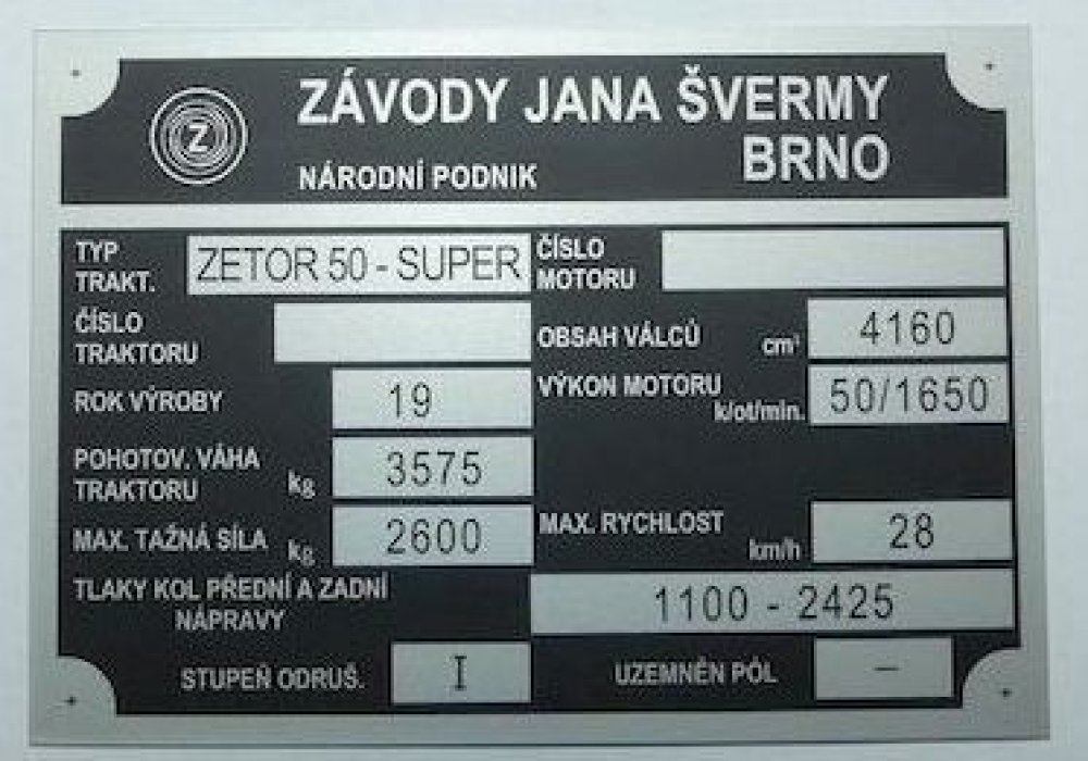 Věrná replika původních štítku.Provedení elox. hliník. Doživotní záruka na černou barvu.Další služba: Na výrobní možný dotisk nebo ražba (raznice 4mm) Vašich údajů. Dotisk nebo ražbu Vašich údajů nutno doobjednat jako "Ražba údajů" nebo "Dotisk údajů". Do "Poznámka k objednávce" potřebujeme vyplnit údaje Vašeho stroje dle TP (číslo stroje tj. VIN, rok výroby, číslo motoru pokud třeba). Razíme pou...