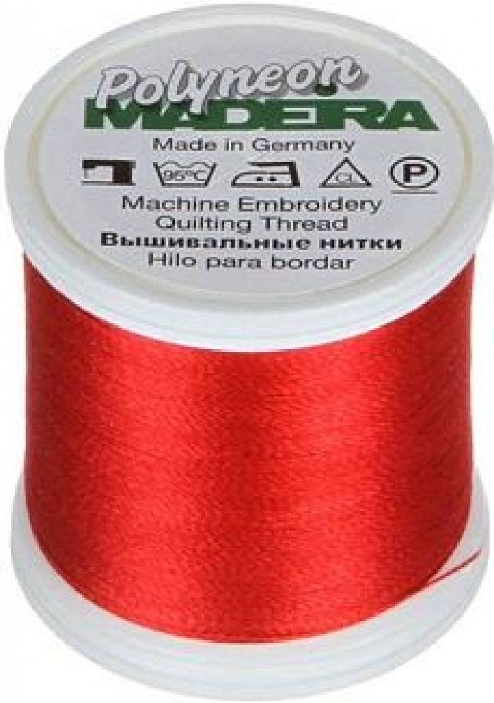 Vyšívací nitě PES Madeira Polyneon (400m) Nit Madeira Polyneon je polyesterová nit, která je ideální pro vytváření výšivek na sportovním oblečení, plavkách a často praných materiálech. Vyšívací nit Madeira Polyneon je odolná nit, vhodná pro strojové vyšívání, prošívání, dekorativní šití i šití aplikací. Nitě Polyneon jsou extrémně odolné. Polyneonové barvy zůstavají zářivé, výrazné a lesklé i po častém praní a vystavování slunečnímu světlu, chloru nebo otěru. Pro vyšívání nití Polyneon doporučujeme použití jehel 80/12. Složení nití Polyneon: 100% polyester Údržba: