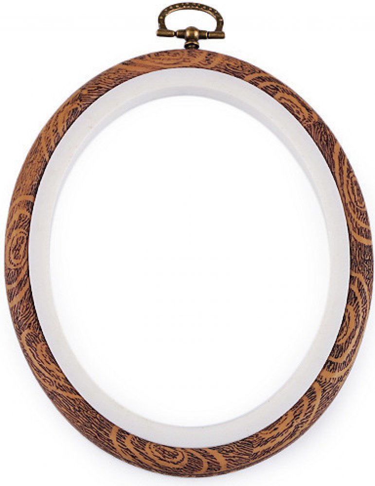 Na vyšívací ovál přichytíte látku, na kterou budete vyšívat obrázek. Skládá se z plastu a pryže, která imituje dřevo. Rámeček je doplněný kovovým šroubkem, pomocí něhož ho můžete pověsit na stěnu.