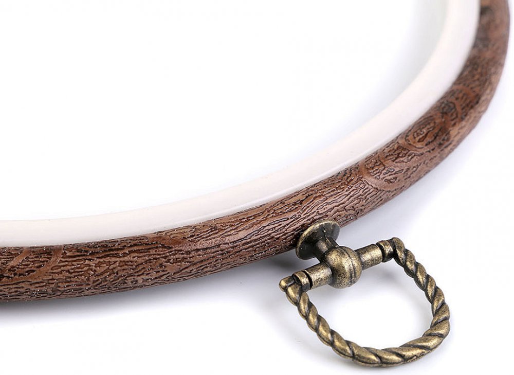 Vyšívací rámeček je vhodný nejen k vyšívání, ale také v něm můžete zhotovený obrázek rovnou vystavit. Je vyrobený z pryže, která imituje dřevo, a plastu. Rámeček je doplněný kovovým šroubkem, pomocí něhož ho můžete pověsit na stěnu.