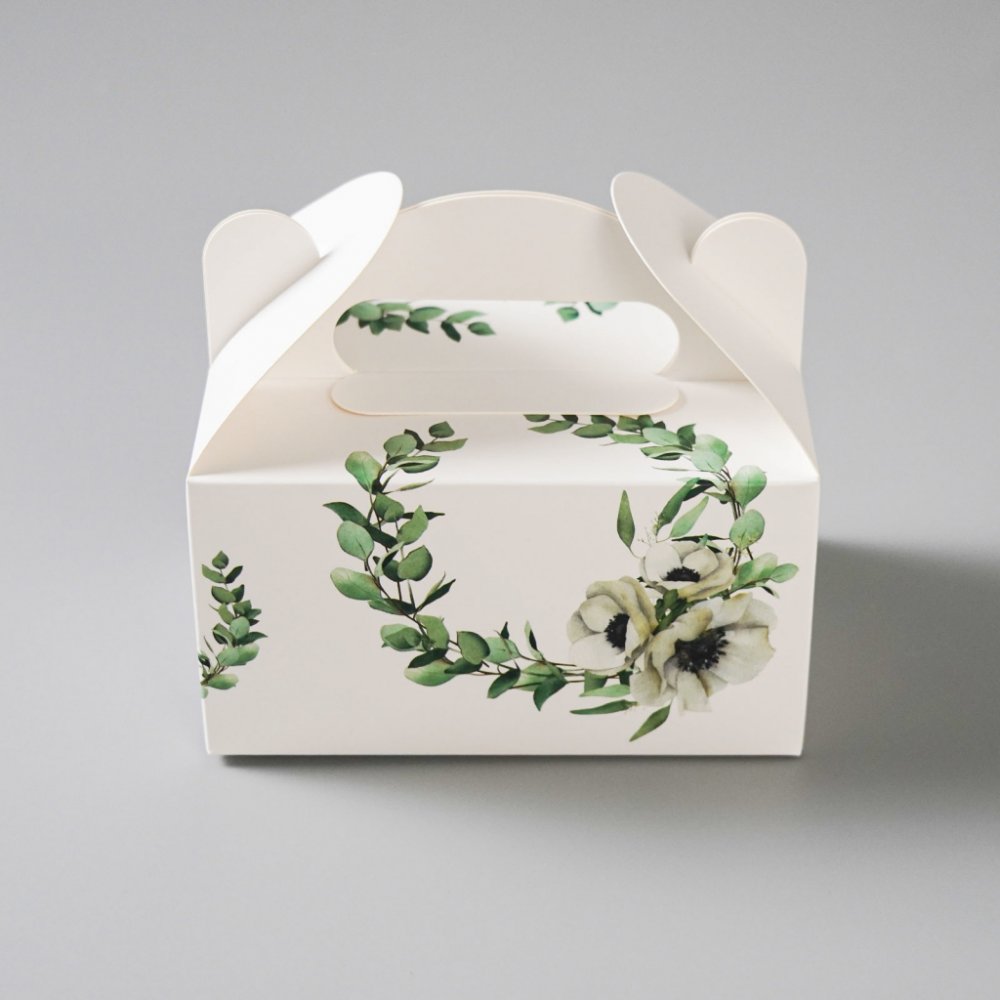 Papírové krabičky na zákusky nebo svatební výslužku v bílé barvě s potiskem by rozhodně na vaší oslavě neměly chybět.