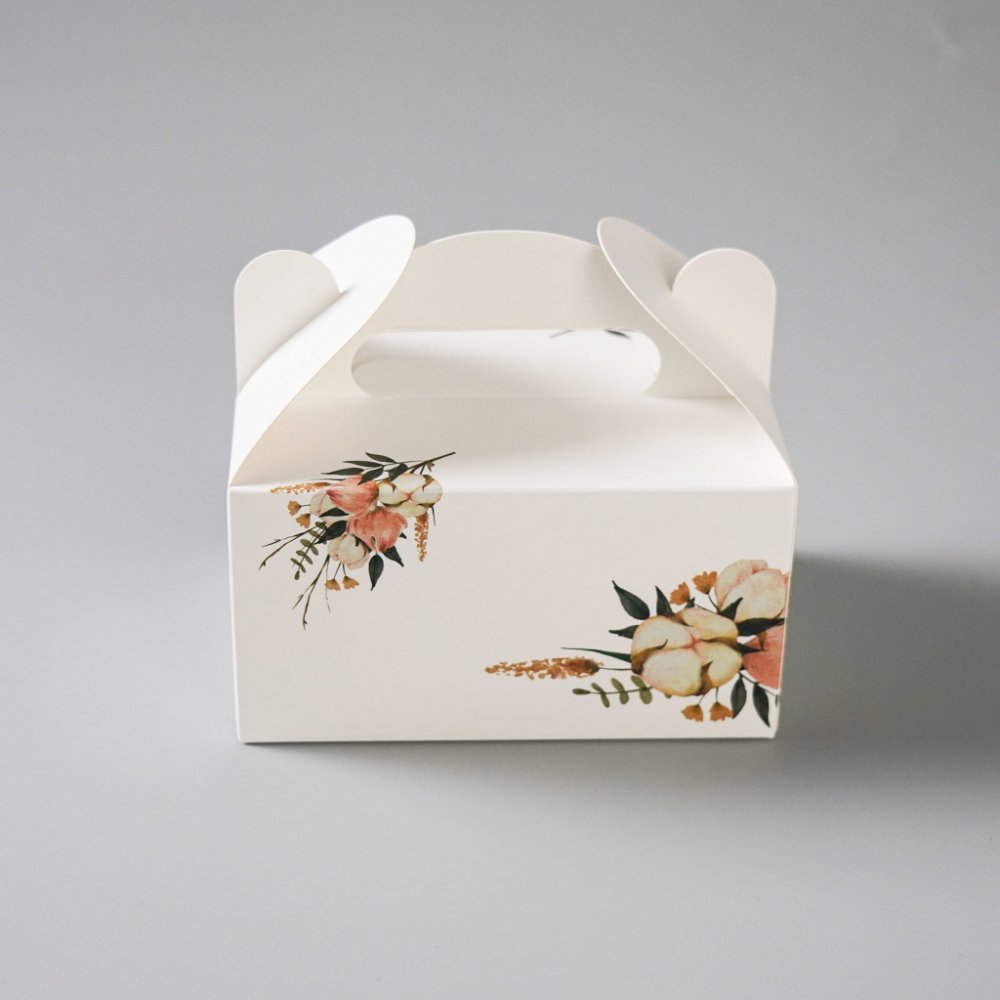 Papírové krabičky na zákusky nebo svatební výslužku v bílé barvě s potiskem by rozhodně na vaší oslavě neměly chybět.