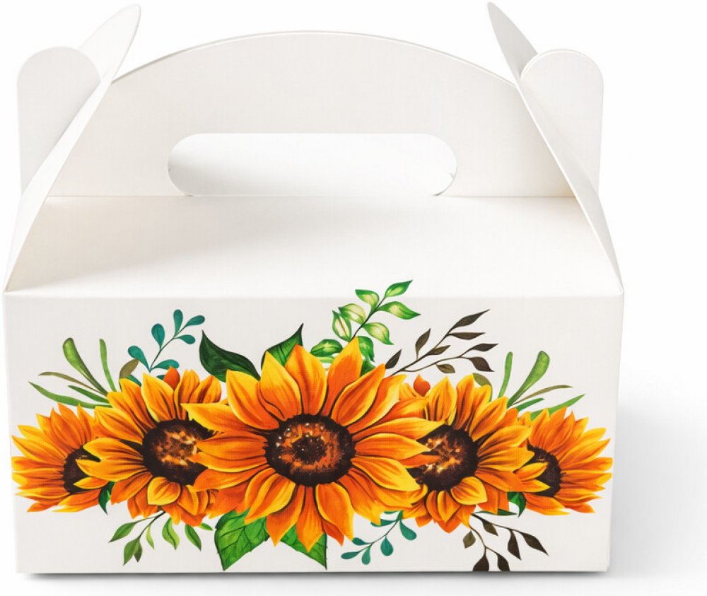 Papírové krabičky na zákusky nebo svatební výslužku v bílé barvě s potiskem by rozhodně na vaší oslavě neměly chybět.