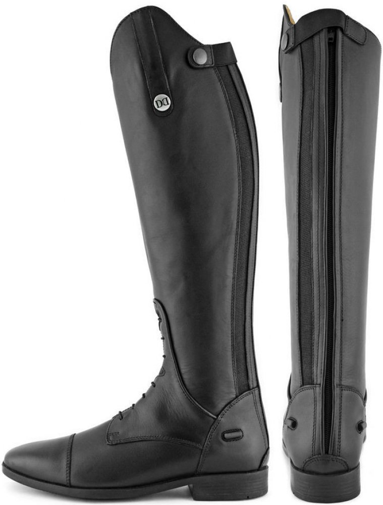 Jezdecké boty Derby vpředu mají elastické šněrování, vzadu po celé délce zip, který je krytý krytkami. Díky tomu je umožněno pohodlné nazouvání i zouvání.